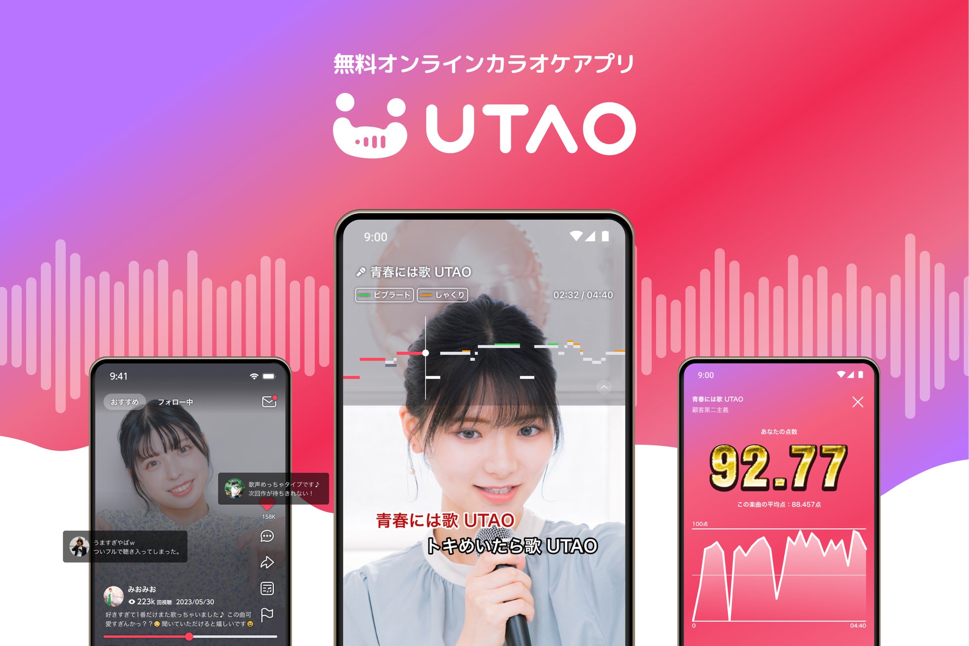 「UTAO」は、西日本最大規模のカラオケチェーン「ジャンカラ」を中心とするエンターテインメント事業を手掛けるTOAIが提供する、いつでもどこでも何度でも2万曲以上の楽曲を全て無料で歌うことができるオンラインカラオケアプリです。JOYSOUNDの高音質音源を採用していることや、高精度の分析結果が折れ線グラフで確認できるなど、本格的なカラオケがスマホ1台で楽しめます。