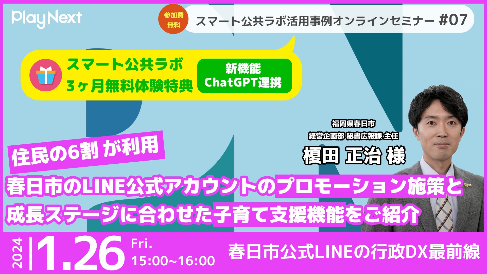 第7回スマート公共ラボ活用事例セミナー「住民の60%が利用する福岡県春日市の事例」をテーマに1月26日無料開催!さらに、3ヶ月無料体験特典付き!ChatGPT連携機能も試せる!