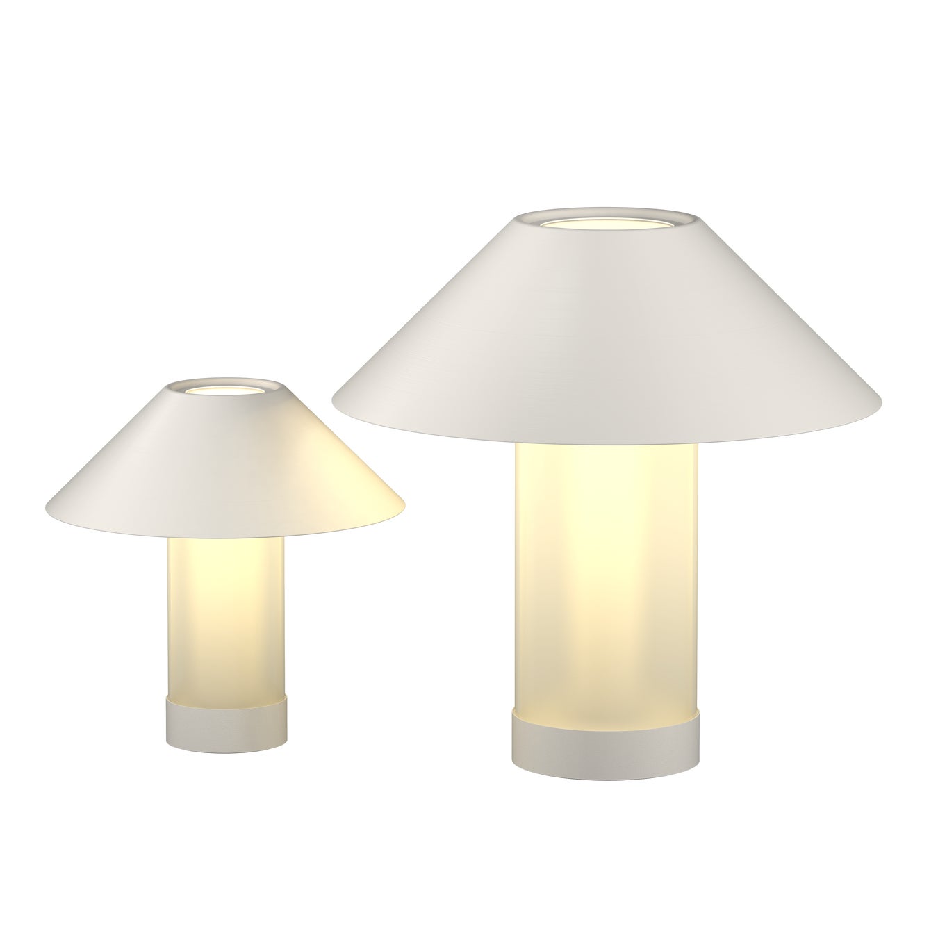 半透明のガラス管から透ける光が、読書の手元をやさしく照らすテーブルランプGEO(ジオ)。縦横比1:1の幾何学フォルムが、凛とした存在感を放ちます。