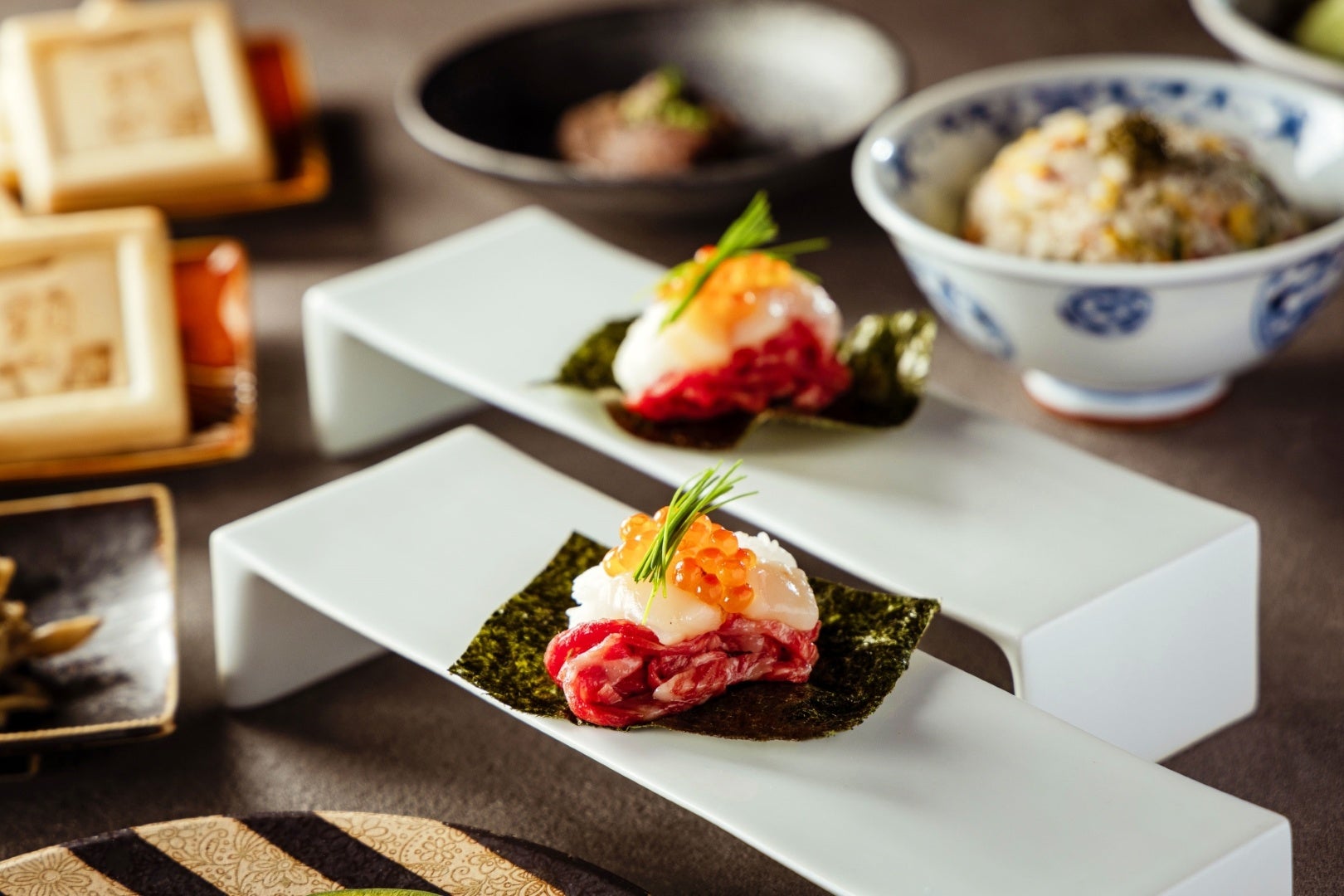 和牛を塩漬けにして熟成させた限りなく生に近い食感の和牛を使用し、海鮮(帆立・いくら)とのマリアージュをお楽しみください。