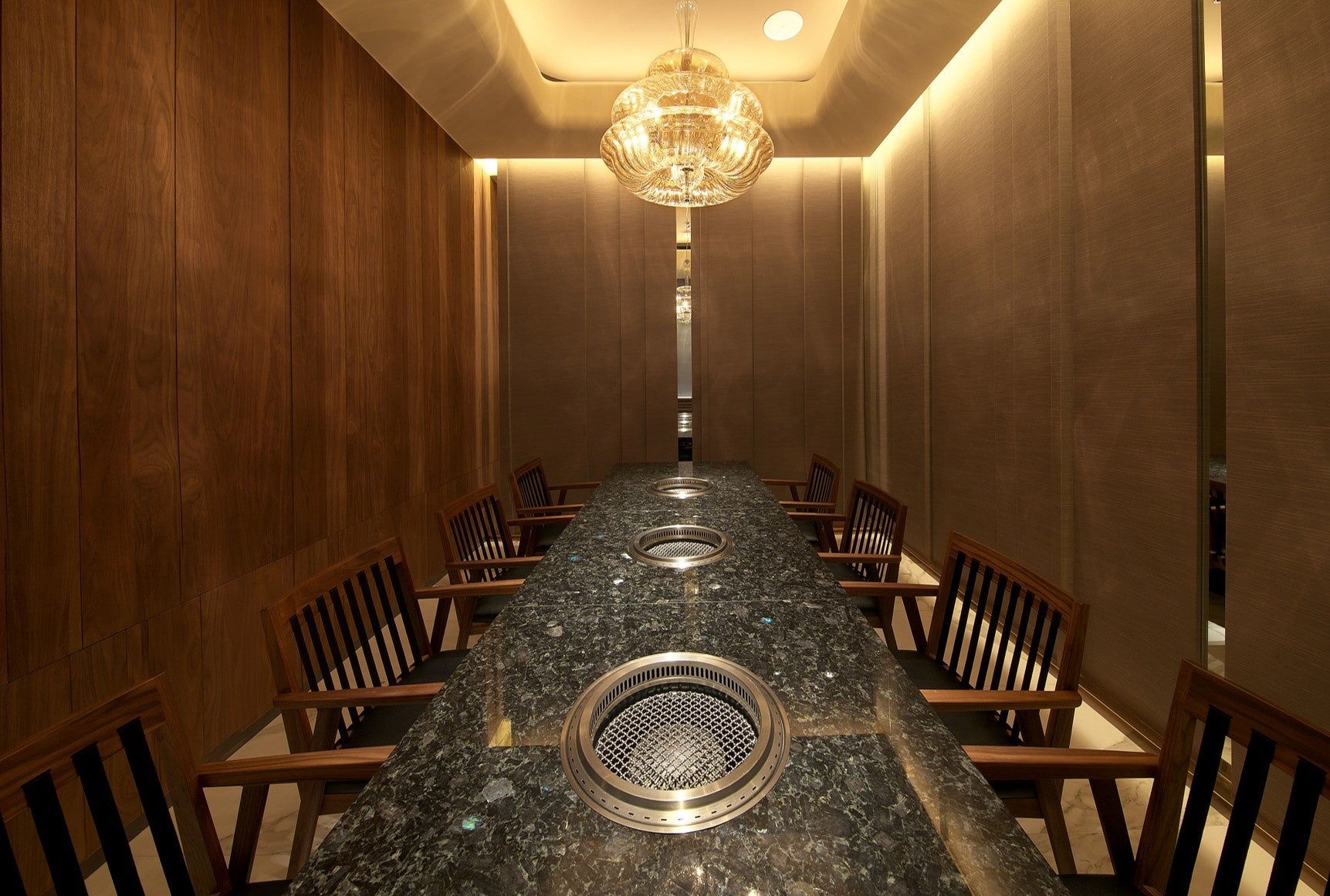 黒を基調に、温かみのある木目と上品なシャンパンゴールドが高級感を演出した店内。デートや会食にも使い勝手のよい個室を5室ご用意しております。大理石のテーブルが上質な大人の空間を生み出しています。