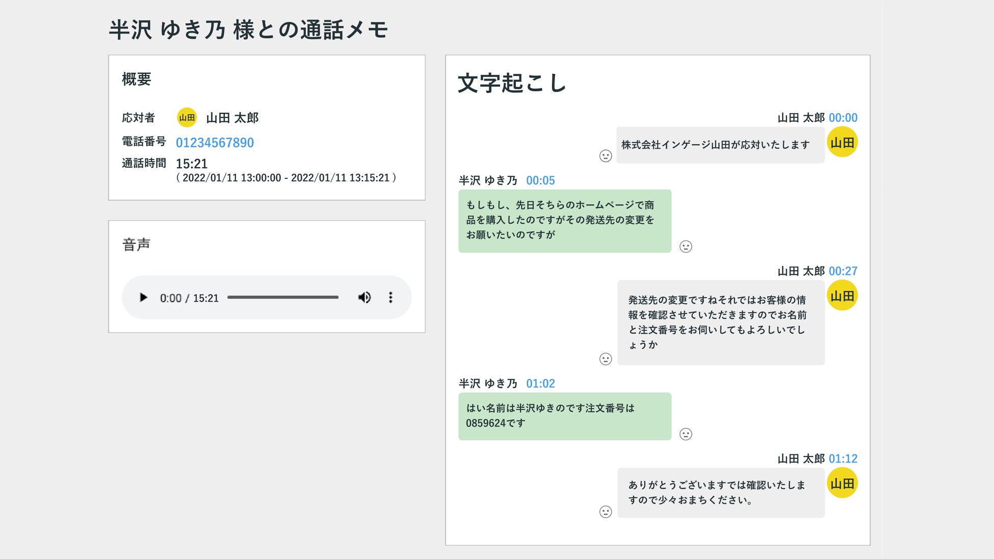 通話記録は自動的に録音と文字起こしがされるため、通話後にメモを残す時間を大幅に短縮。また正確な情報が残るため「言った・言わない」で生じるトラブルを解決。またオペレータ業務の改善や教育に活用いただけます。