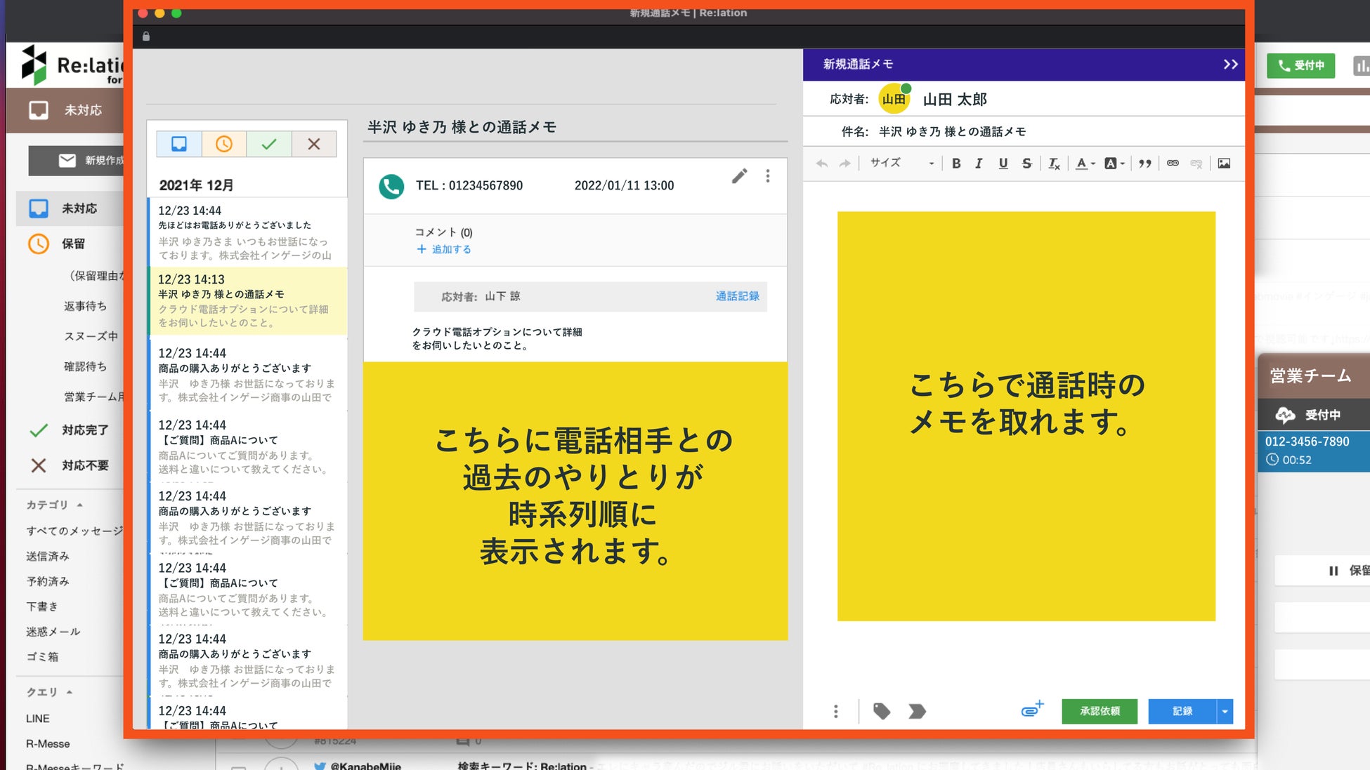 特徴③:受電時に通話用メモとこれまでの対応履歴が自動で表示