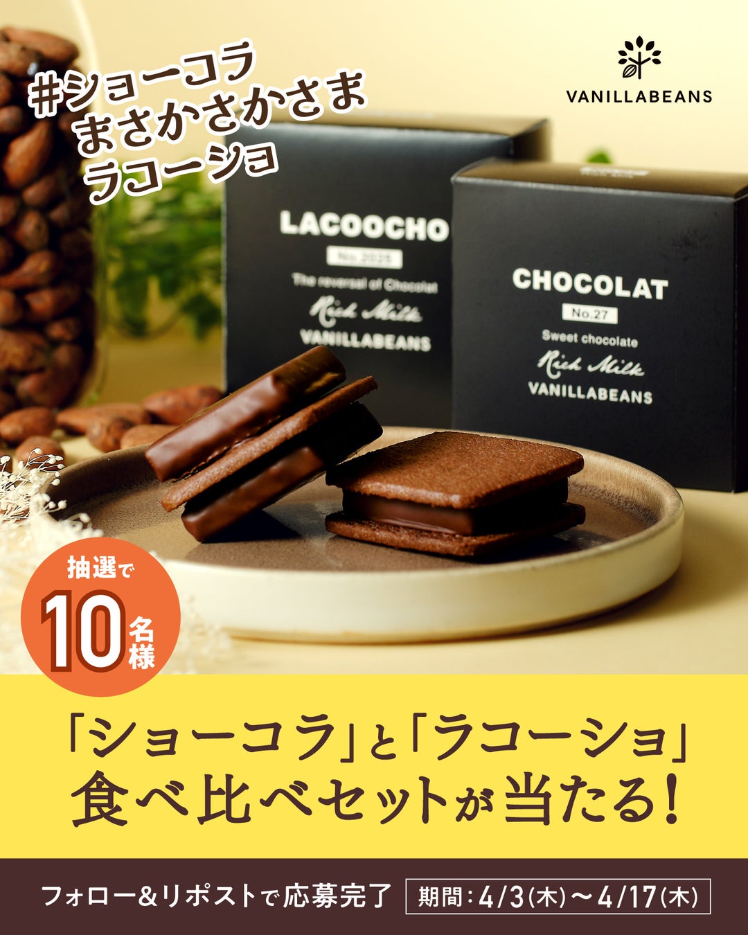 VANILLABEANSの公式Instagramまたは公式X(旧Twitter)をフォロー&キャンペーン投稿をいいね(Xの場合はリポスト)すると抽選で「ショーコラ」と「ラコーショ」各1個の食べ比べセットが当たります。