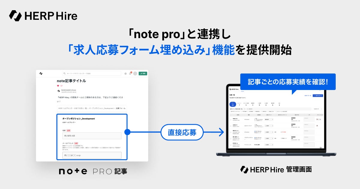株式会社HERP(本社:東京都品川区、代表取締役:庄田一郎)は、採用管理システム『HERP Hire』において、note株式会社が提供する法人向け高機能プラン「note pro」と連携し、「求人応募フォーム埋め込み」機能の提供を開始しました。これにより、noteの記事から直接応募できるとともに、『HERP Hire』上で記事ごとの応募数や採用歩留まりを確認できるため、より効果的な採用広報活動を支援します。