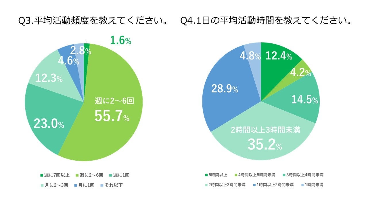 - 1回における平均活動時間は2~3時間が最多、3時間以上も3割以上いる結果に