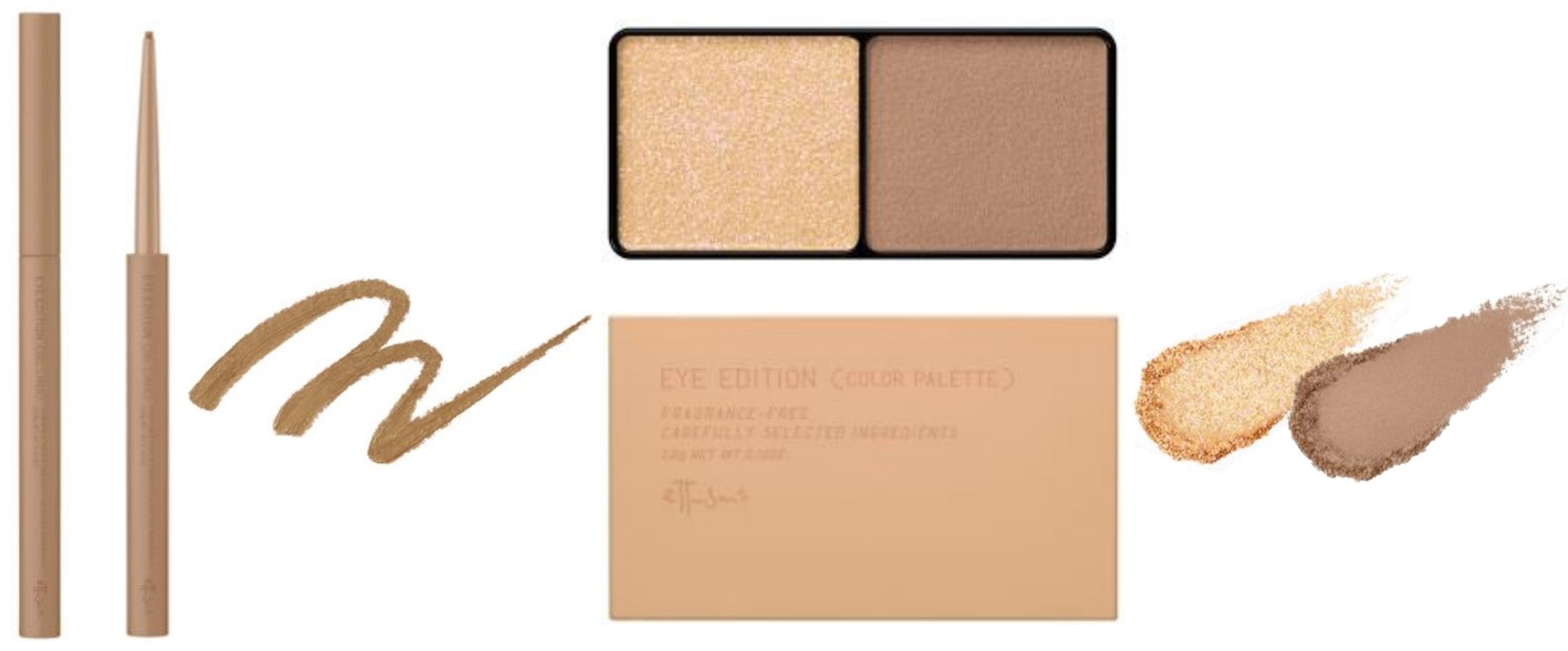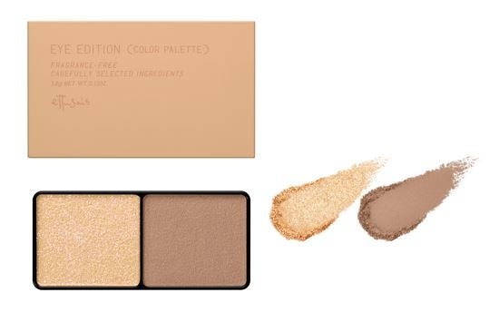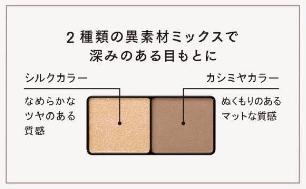 カラーパレットは、 イエベでもブルべでも使いやすい、程よい黄みにアレンジしたゴールドベージュのツヤ質感シルクカラーと、まろやかブラウンのマット質感カシミヤカラーの2種をセット。合わせて使うと、程よいスモーキーさを感じさせ、さりげなく印象的な仕上がりを演出します。