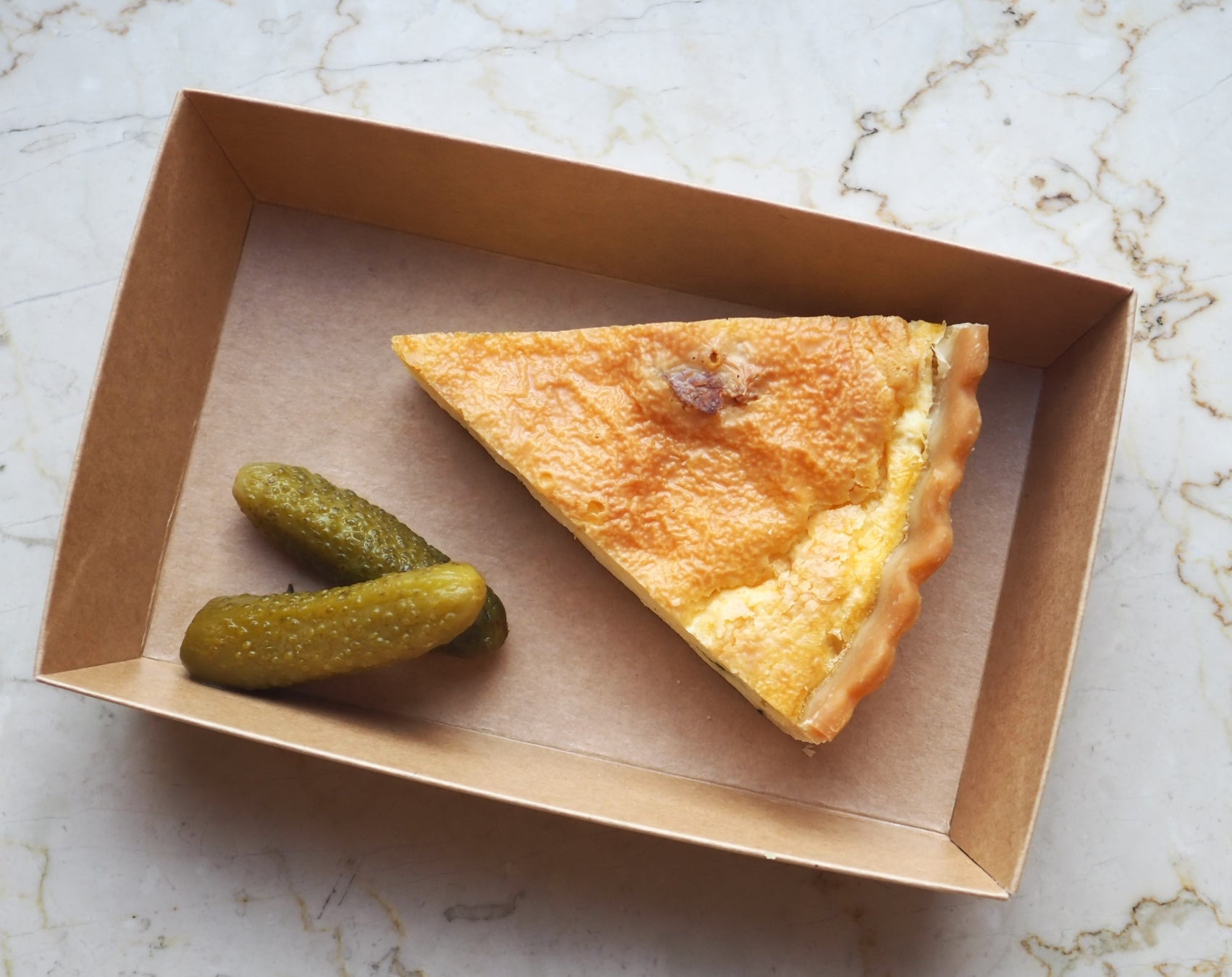 卵と生クリームの生地に三元豚の旨味を加え、ベーコンを混ぜ込み焼き上げたプチサイズのキッシュ。コーニッション(ビネガーに漬け込んだ小さなきゅうり)を添えてお召し上がりください。