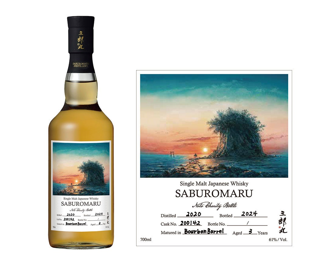 「シングルカスク三郎丸 能登チャリティーボトル」は、三郎丸蒸留所で2020年に蒸留され、3年間熟成されたシングルモルトウイスキーです。三郎丸蒸留所の特徴であるスモーキーなヘビリーピーテッドタイプのウイスキーでラベルイラストは今回の地震で一部崩落してしまった、能登のシンボルとも言える見附島の在りし日の姿と昇る朝日に復興への想いを込めています。三郎丸蒸留所代表の稲垣貴彦、日本初のウイスキーボトラーズであるT&T TOYAMA代表の下野孔明氏、ウイスキーブロガーであるくりりん氏の3名で選定したひと樽となります。