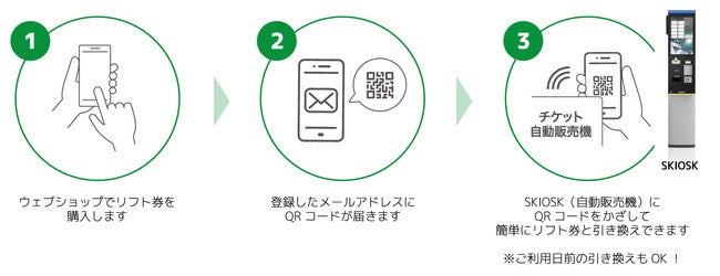 八方尾根スキー場のWEBSHOPでは、リフト券をお得に購入することができるのはもちろん、滑走当日はスマホに届いたQRコードを自動販売機にかざすだけでスムーズに発券できます。