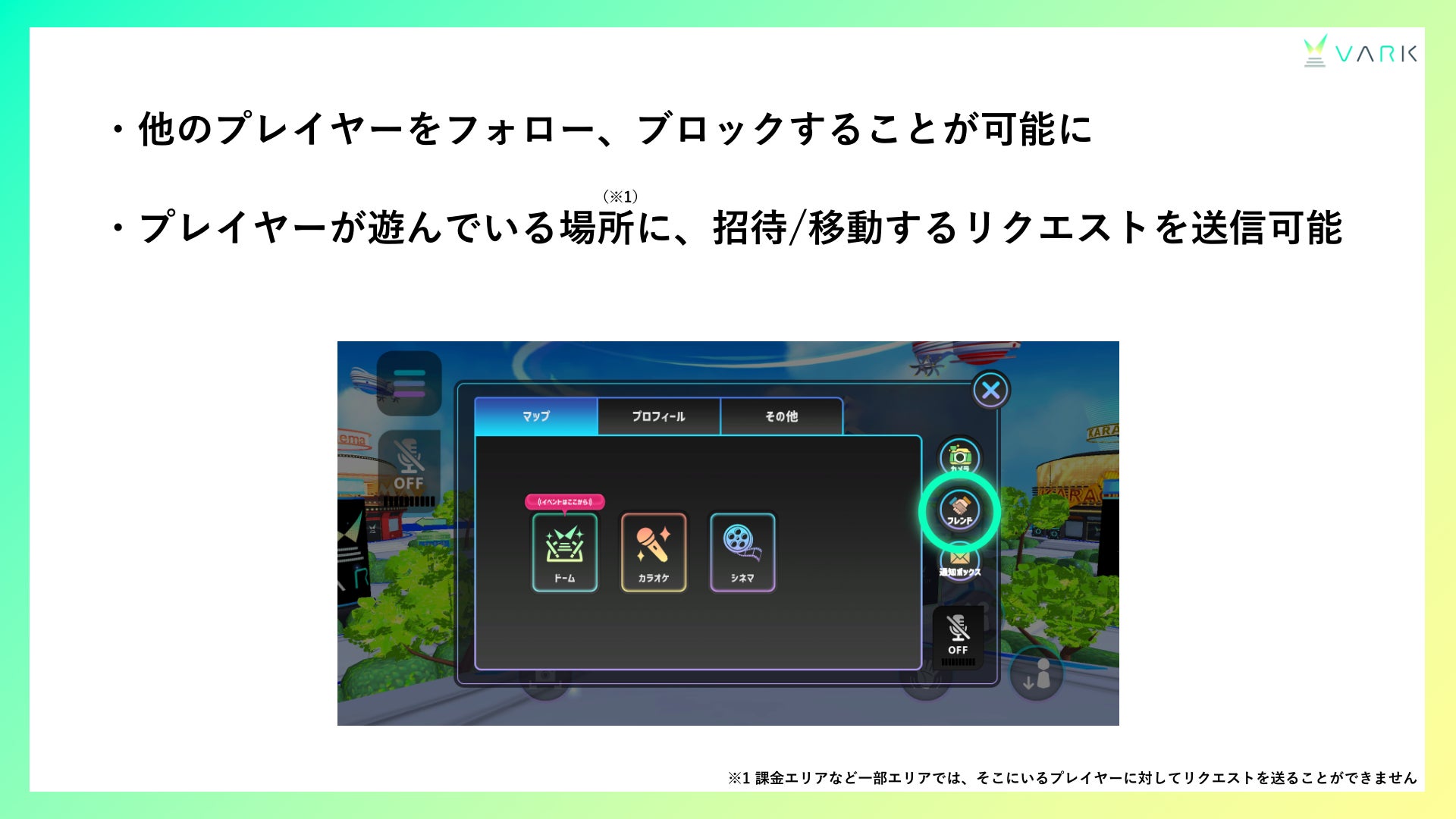 エンターテイメント特化型メタバース「VARK」で、アカウント連携によるデータ引継ぎとフレンド機能が追加!