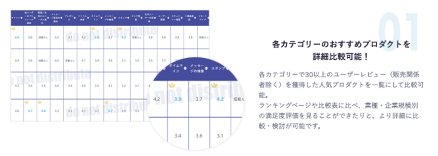 また、ご利用プランによっては、カテゴリーレポートの内容を自社のマーケティングコンテンツ等に二次利用いただけます。自社製品の特徴や訴求ポイントを客観的な評価データとともにアピール可能になります。詳細はセールス担当・カスタマーサクセス担当までお問合せください。