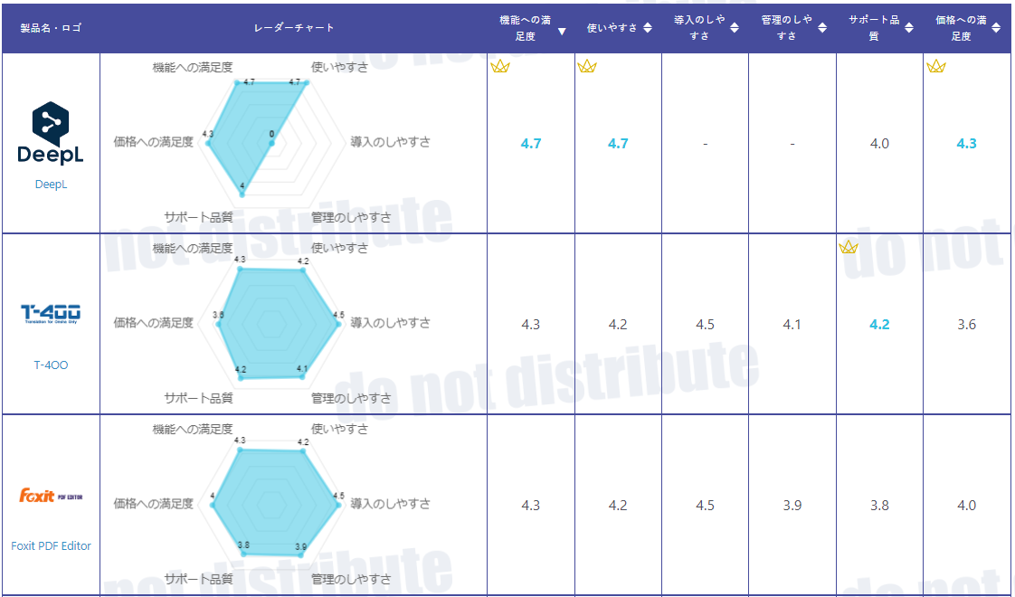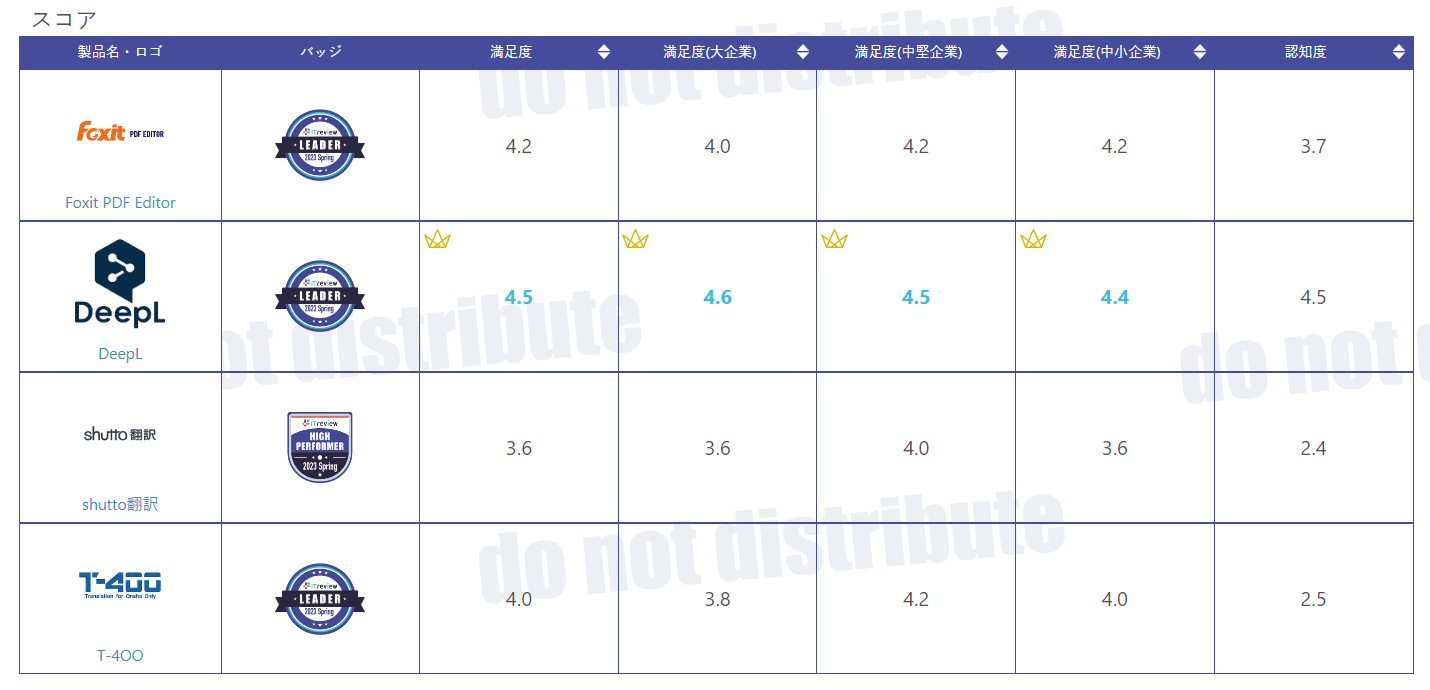 ITreview カテゴリーレポートは、ITreviewに掲載するカテゴリーごとに30件以上のレビューを集めた製品を掲載しております。一例として今回新たに公開となった「AI翻訳・自動翻訳(テキスト翻訳)ツールと」カテゴリーをご紹介いたします。本カテゴリーでは、Foxit PDF Editor 、DeepL、shutto翻訳、T-4OOの4製品でその違いを比較いただけます。