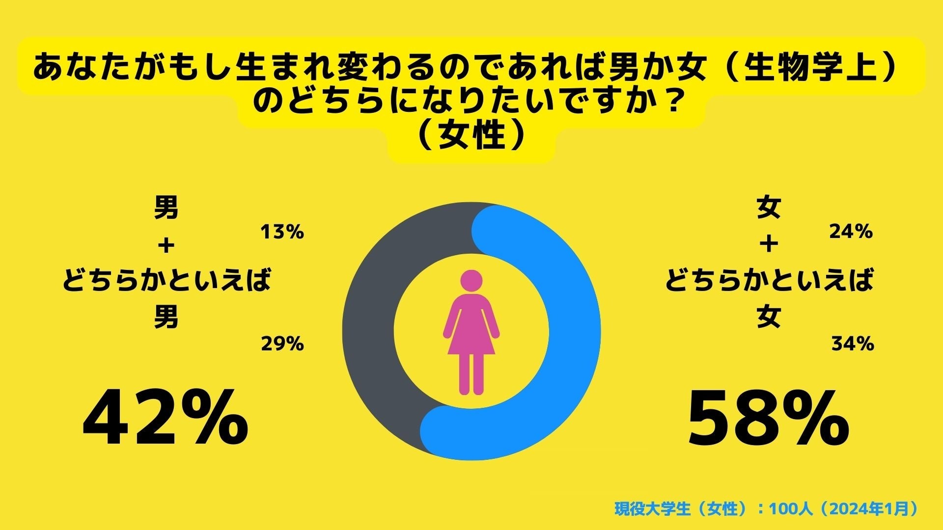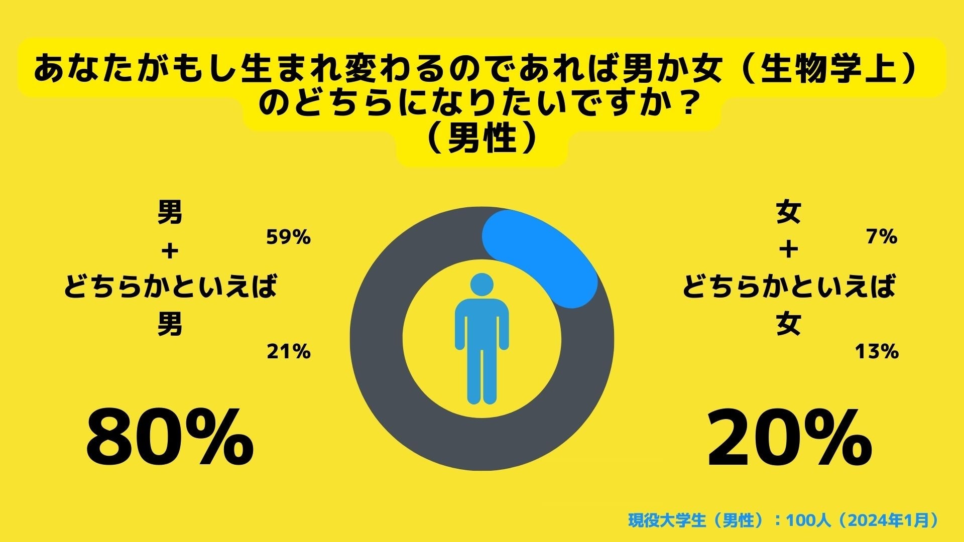 続いては、「もし生まれ変わるのであれば男か女(生物学上)のどちらになりたいですか?」という調査を行いました。その結果、女に生まれ変わりたい男性の割合よりも男に生まれ変わりたい女性の割合の方が高いことが判明しました。