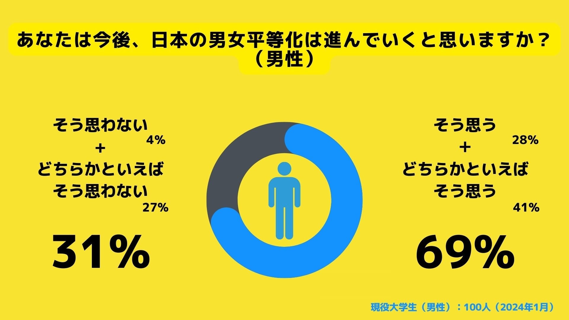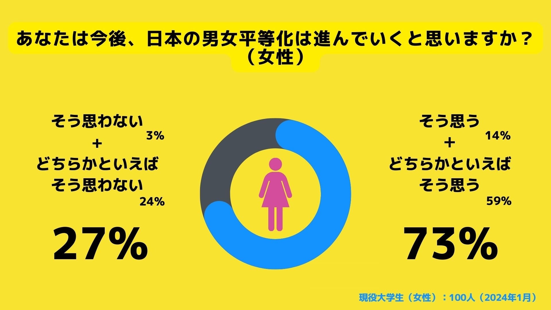 「今後、日本の男女平等化は進んでいくと思いますか?」という設問では「そう思う」と回答した男性は69%、女性は73%という結果に。