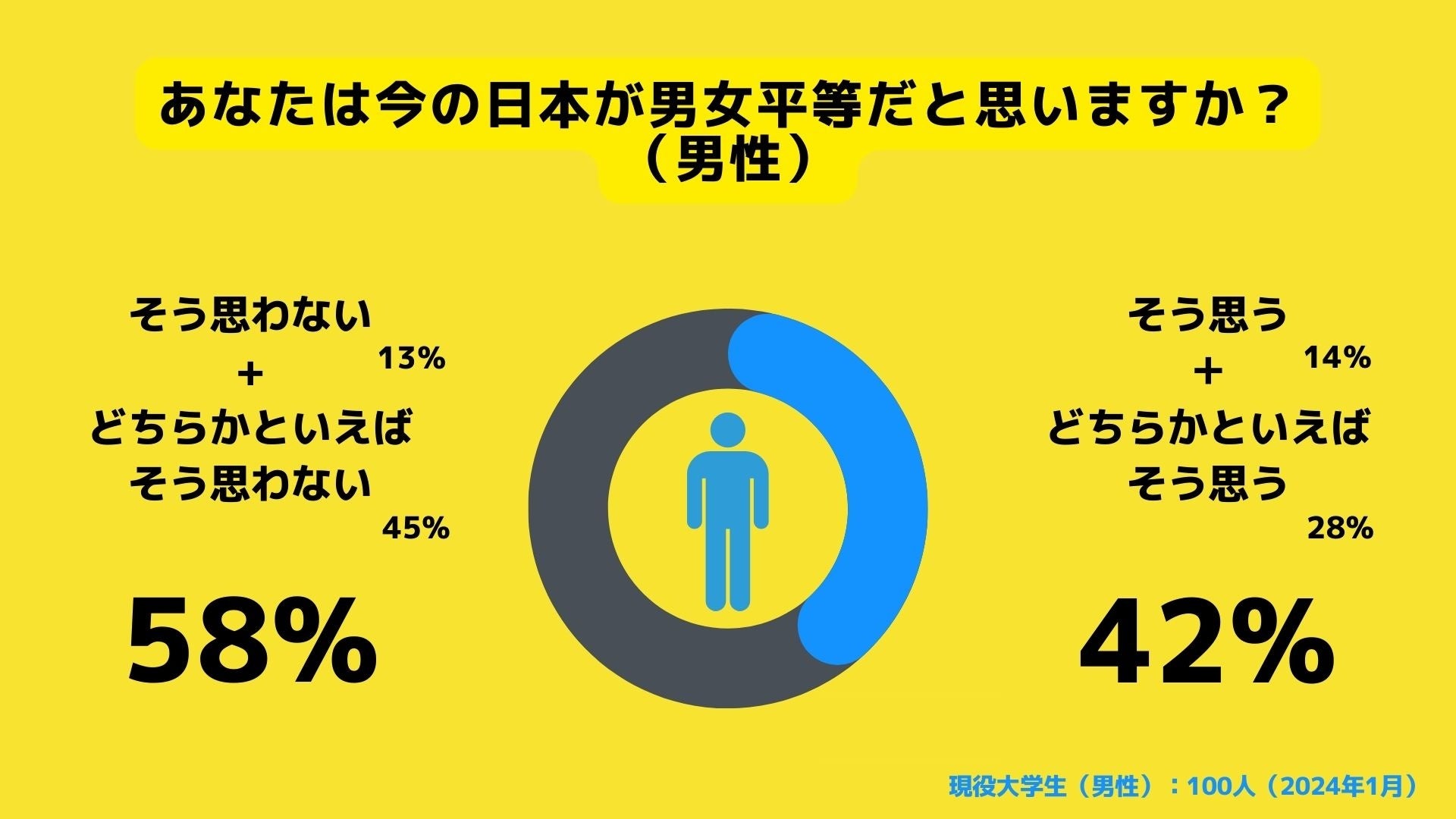 【Z世代のホンネ調査】大学生のジェンダー問題への意識調査。「今の日本が男女平等だと思いますか?」という設問で「そう思う」と回答した男性は42%、女性は22%という結果に。