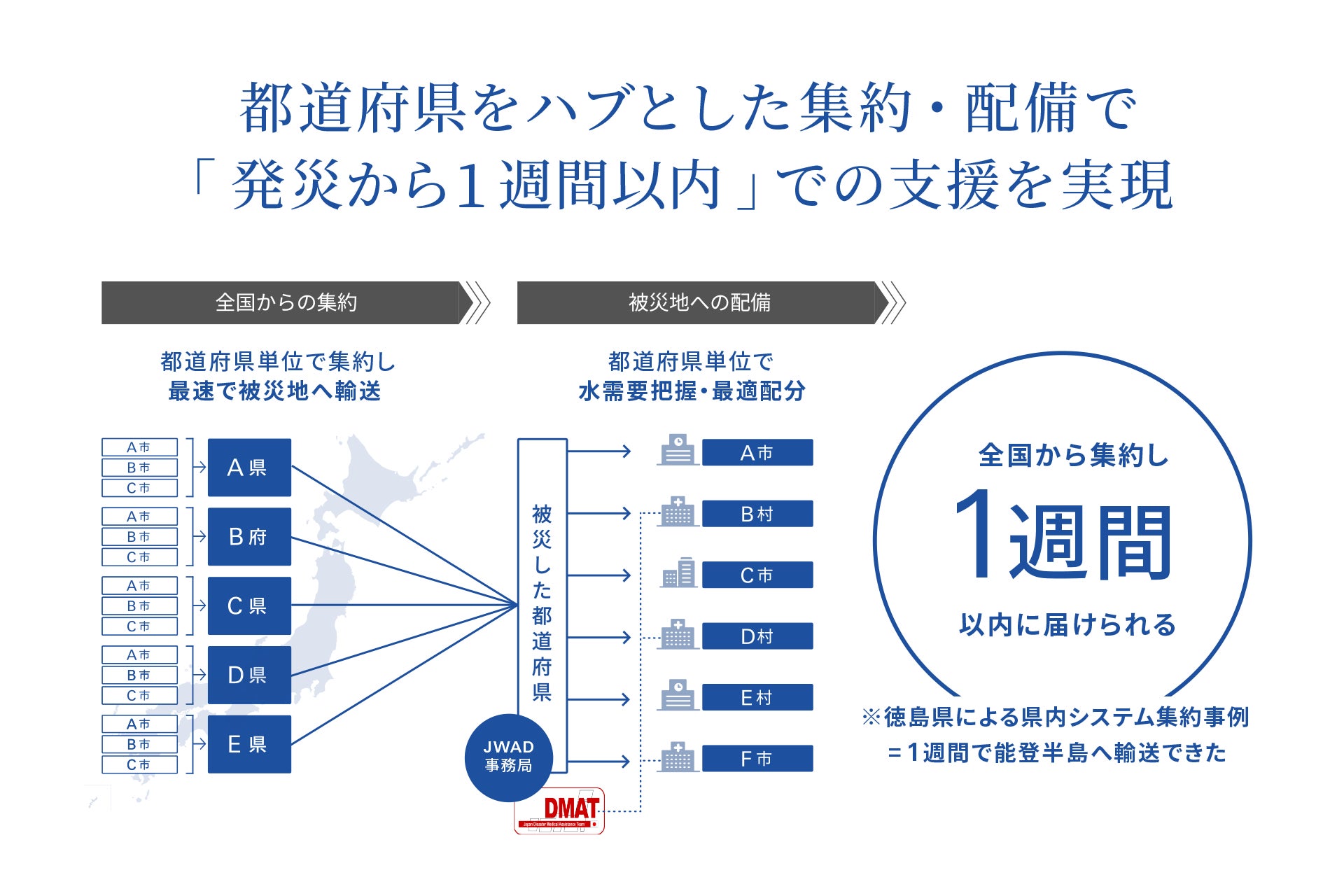 国難級災害に備え、運営組織「JWAD」の支援により、全国47都道府県での生活用水資機材の相互支援体制を強化