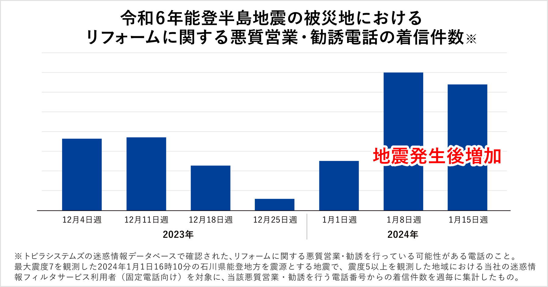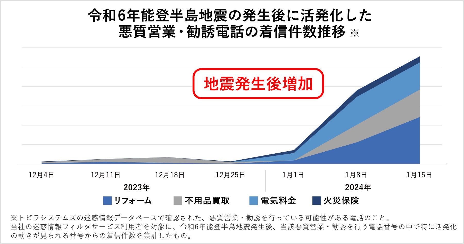トビラシステムズの調査では、今般の地震の発生後、不用品買取やリフォームなど、住宅や住環境に関連する悪質営業・勧誘の電話が増加している傾向が見られました。