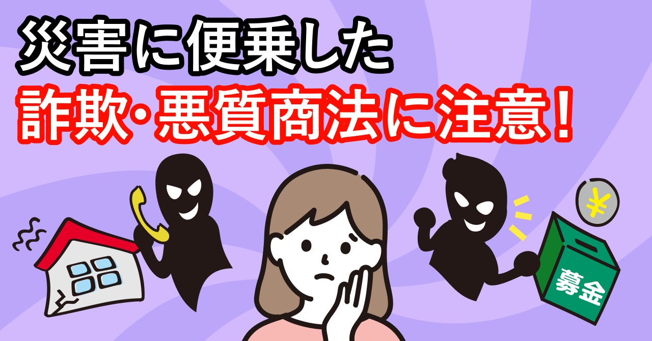 被災地周辺はもちろん、被災地から離れた地域にお住まいの方々も、被災地支援などに便乗した特殊詐欺や悪質商法にご注意ください。