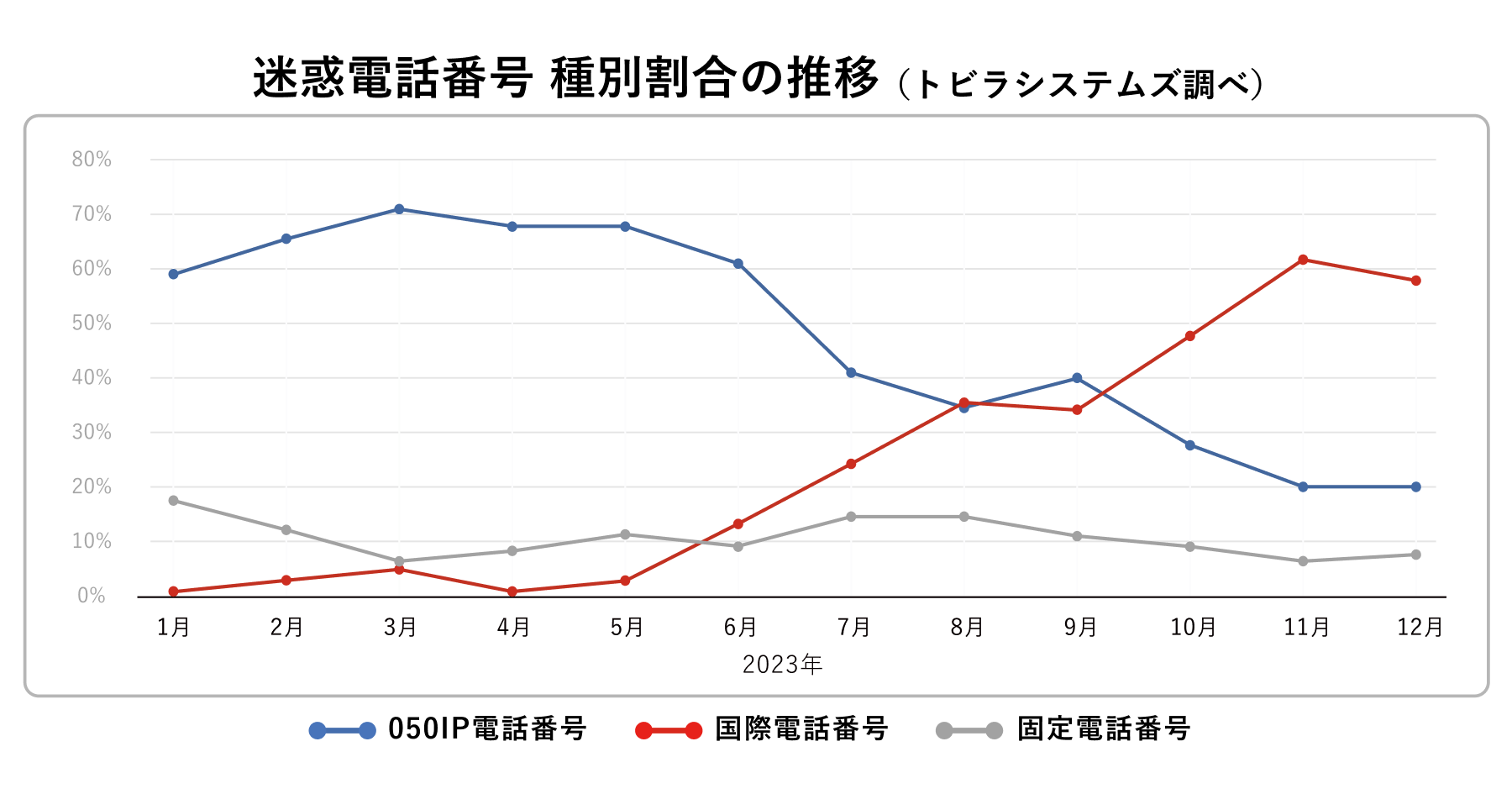 国際電話番号を利用した特殊詐欺が多発しています。トビラシステムズの調査で、2023年12月に新たに確認された迷惑電話番号の種別割合は、国際電話番号の割合が58.4%で、前月からほぼ横ばい傾向で推移しています。