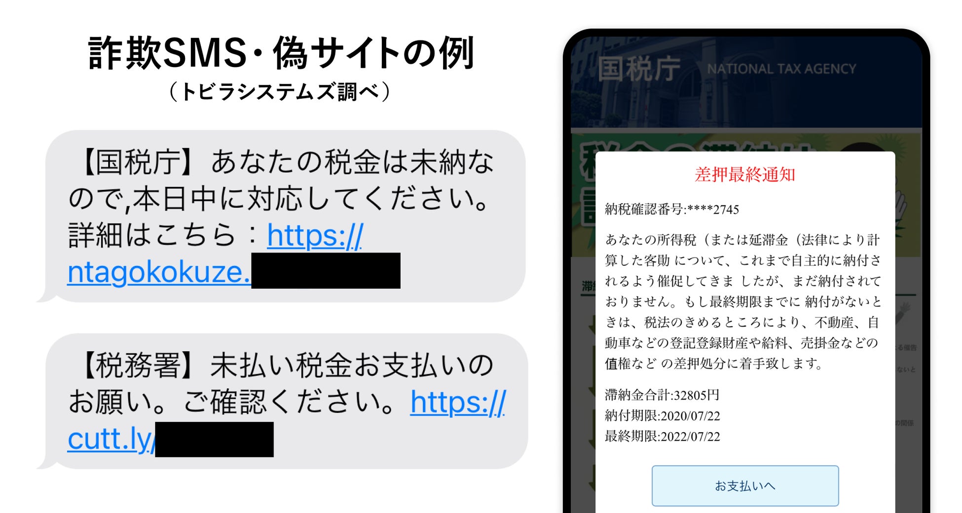 トビラシステムズの調査では、過去に国税庁や税務署をかたる詐欺SMSや偽サイトの発生が確認されています。