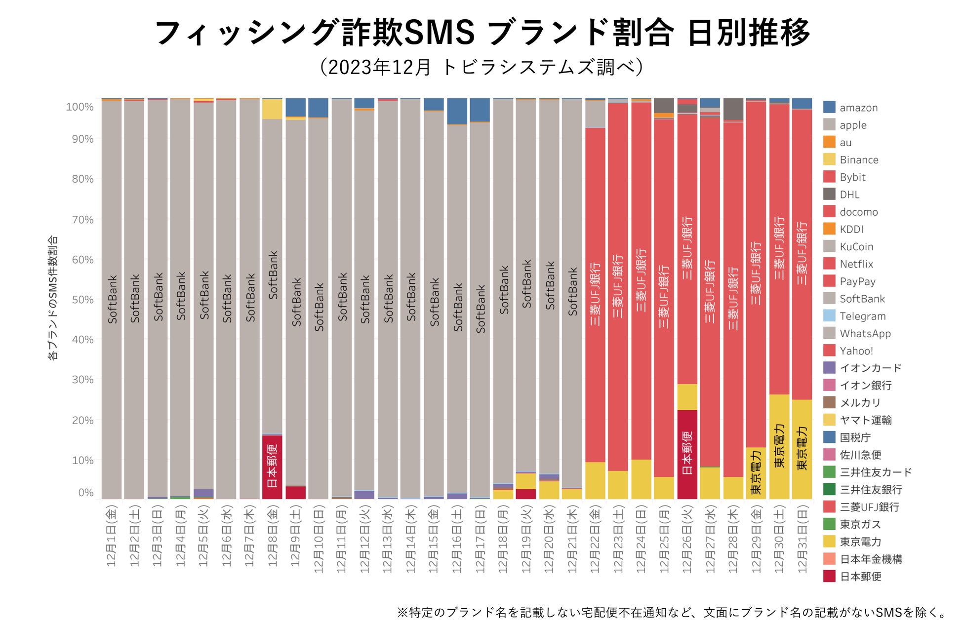 実在する企業やブランドの名前をかたる詐欺SMSについて、2023年12月1日〜12月21日は「SoftBank」、12月22日以降は「三菱UFJ銀行」をかたる文面が目立ちました。