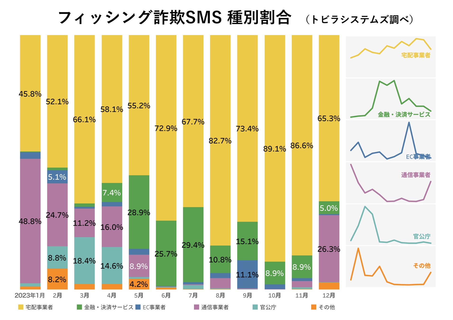 トビラシステムズの調査で、2023年12月に確認されたフィッシング詐欺のSMSの種別割合は、通信事業者をかたる手口が急増し26.3%となりました。宅配事業者をかたる手口も引き続き多く、65.3%を占めました。宅配事業者をかたるSMSの文面は種類が多く変化も著しいことから、生成AIなどを使用し多様な文面を作成している可能性も考えられます。