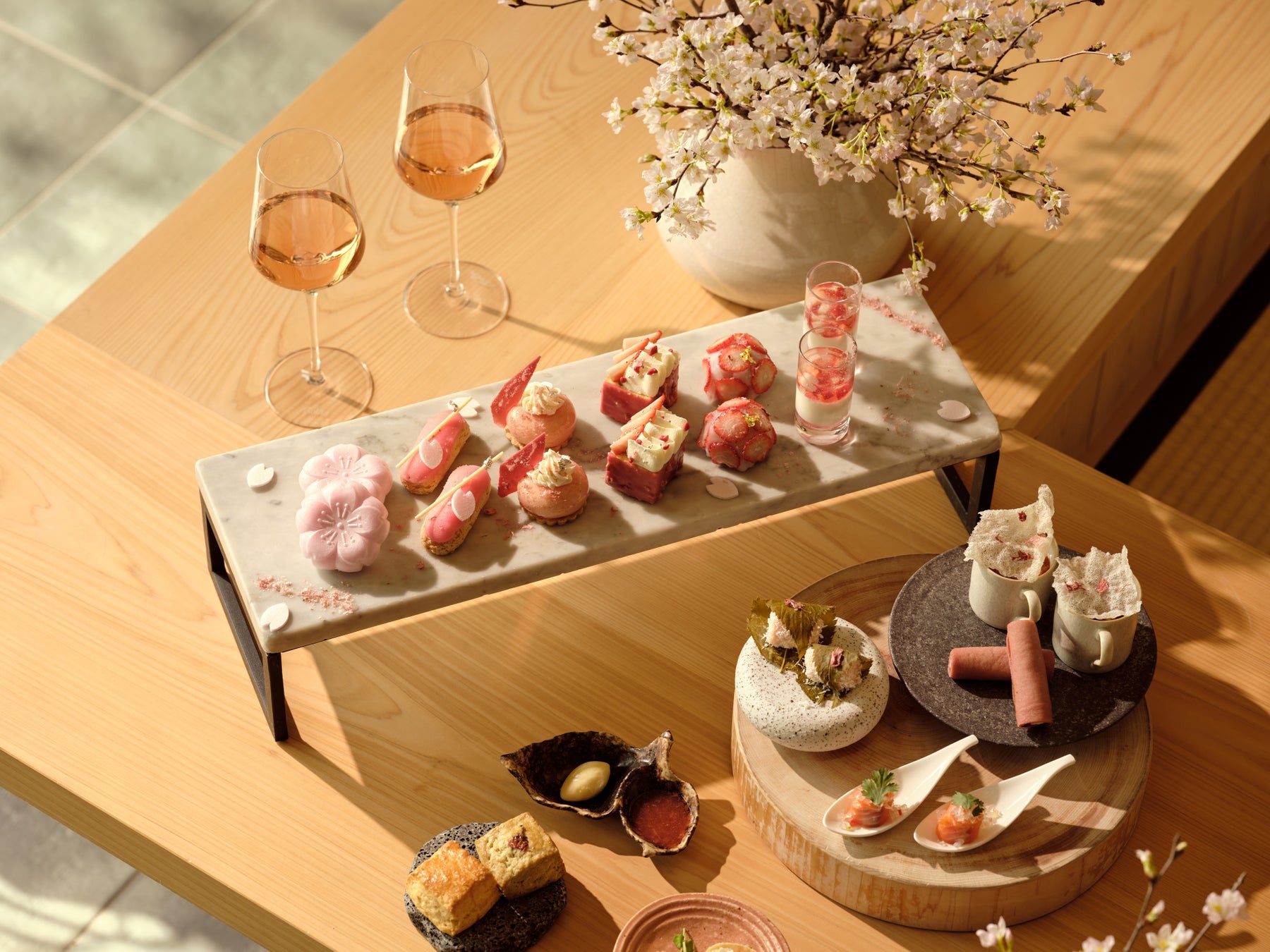 桜と自社茶園「デュシット・ティー・ファーム」の抹茶を使用したスイーツや、旬の自然栽培野菜を活かしたセイボリーを、コース仕立てでお楽しみいただけます。
