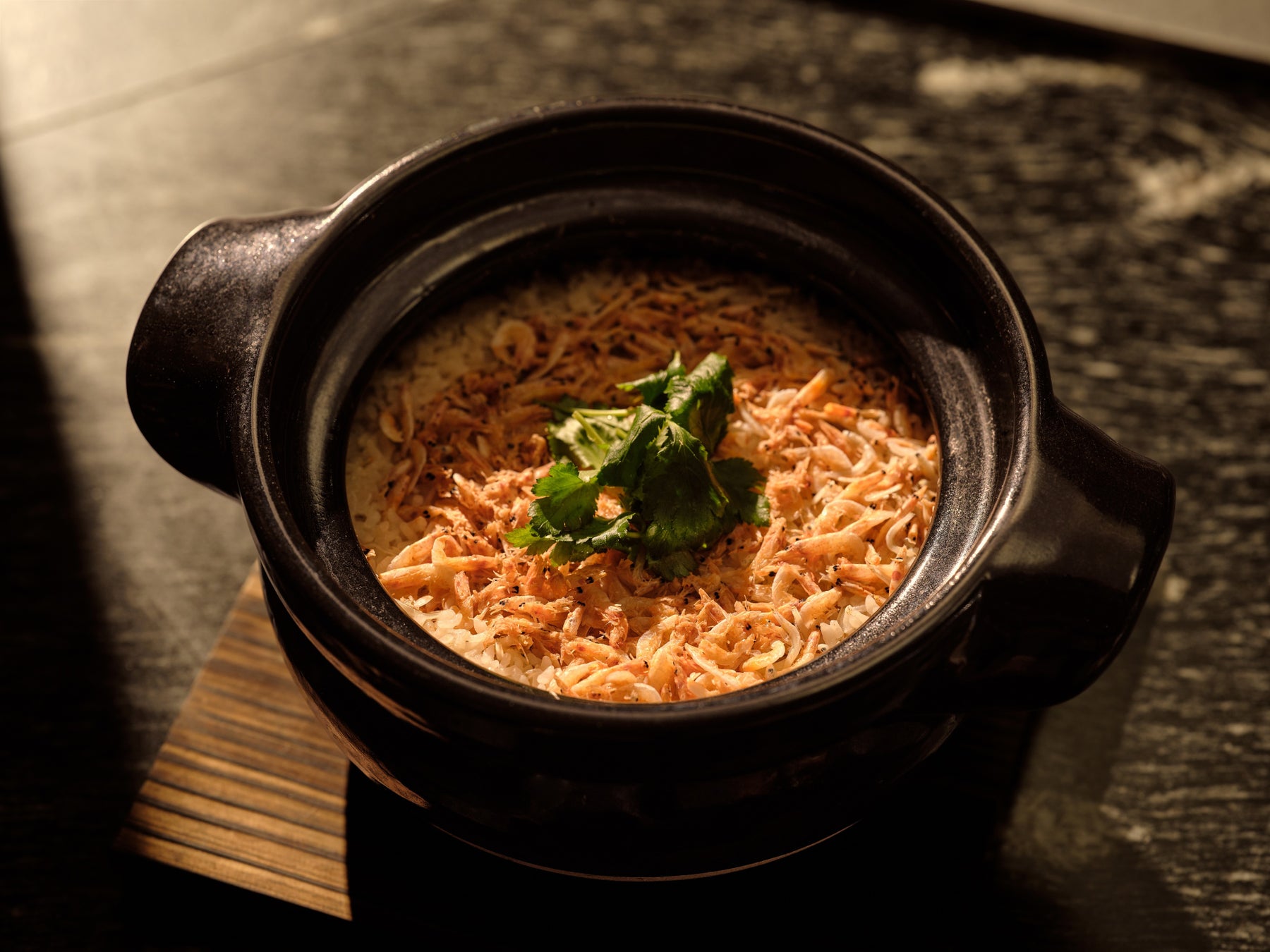 日本の美しい四季を表現する「シェフズテーブル 紅葉」では、目の前で繰り広げられるライブキッチンにて、春の味覚を五感でご堪能いただけます。希少な但馬太田牛をじっくりと焼き上げたメインディッシュのほか、温前菜として、桜海老のリゾットに香ばしくローストした旬の京たけのこを添えた一皿を提供いたします。