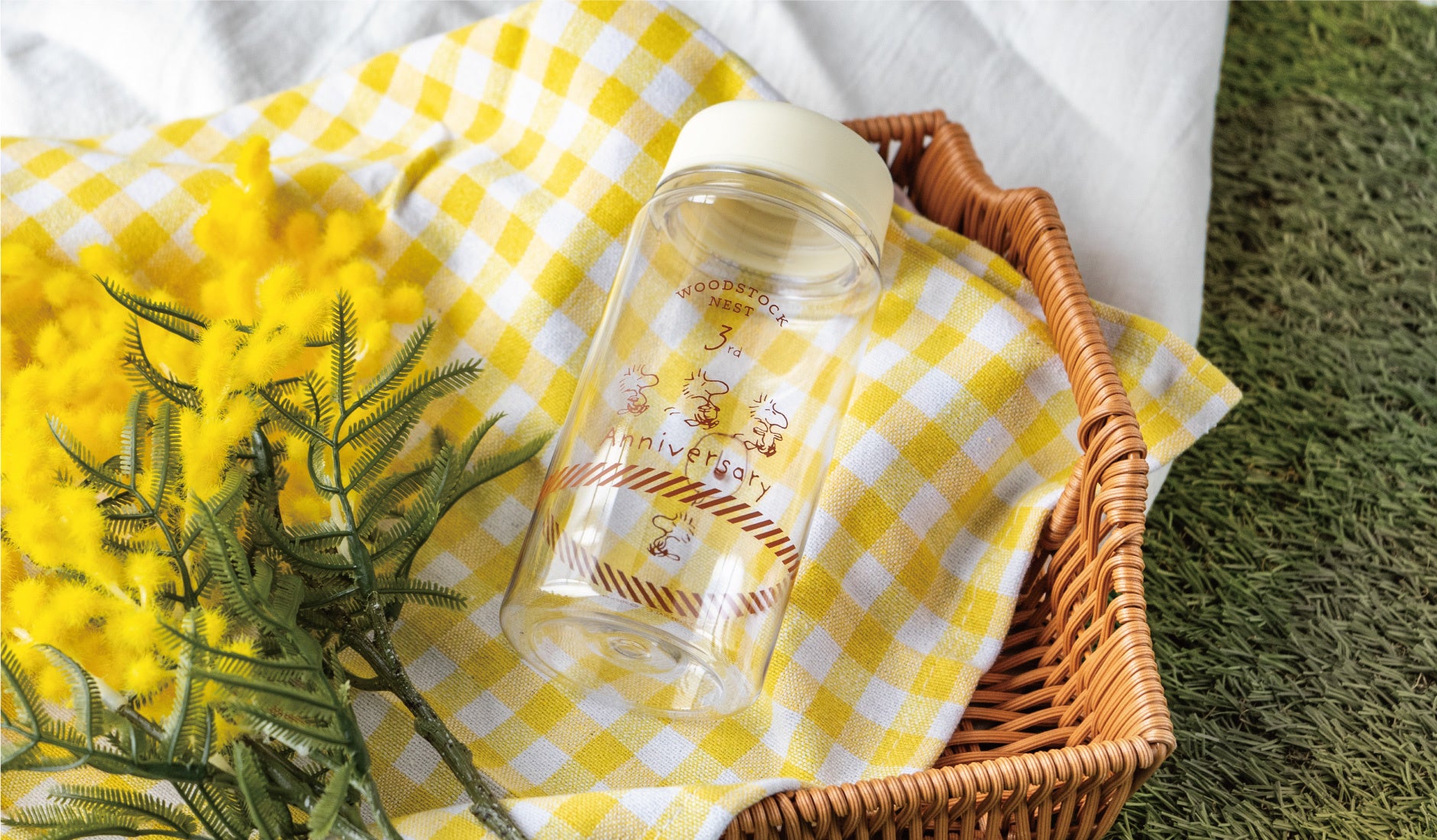 3周年にちなんで3羽のウッドストックたちがならんだデザインのクリアボトルです