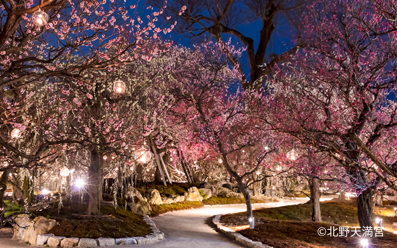 昨年の紅葉シーズンに大好評だったもみじ苑に引き続き、菅原道真公ゆかりの紅白の梅50種約1,500本が、約2万坪の境内一円に咲き競う北野天満宮の梅苑へご招待。2月23日(金・祝)〜3月17日(日)の毎週末は日没後にライトアップされ、2月25日(日)には毎年多くの観梅客で賑わう梅花祭も開催します。