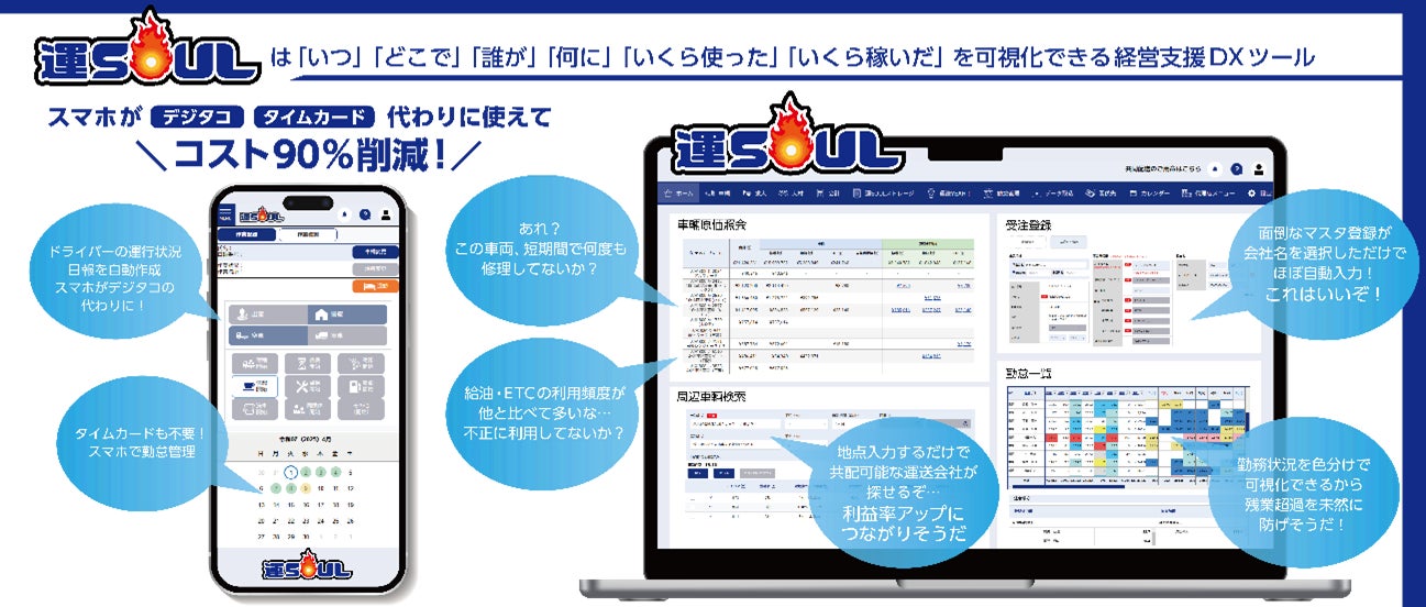 本展示会では、運送業向けの基幹システム「運SOUL」の新機能として、車輛の動態管理だけでなく、ドライバーの業務状況や勤怠もリアルタイムに把握・管理することが可能な、今までに無い動態管理機能を公開いたします。