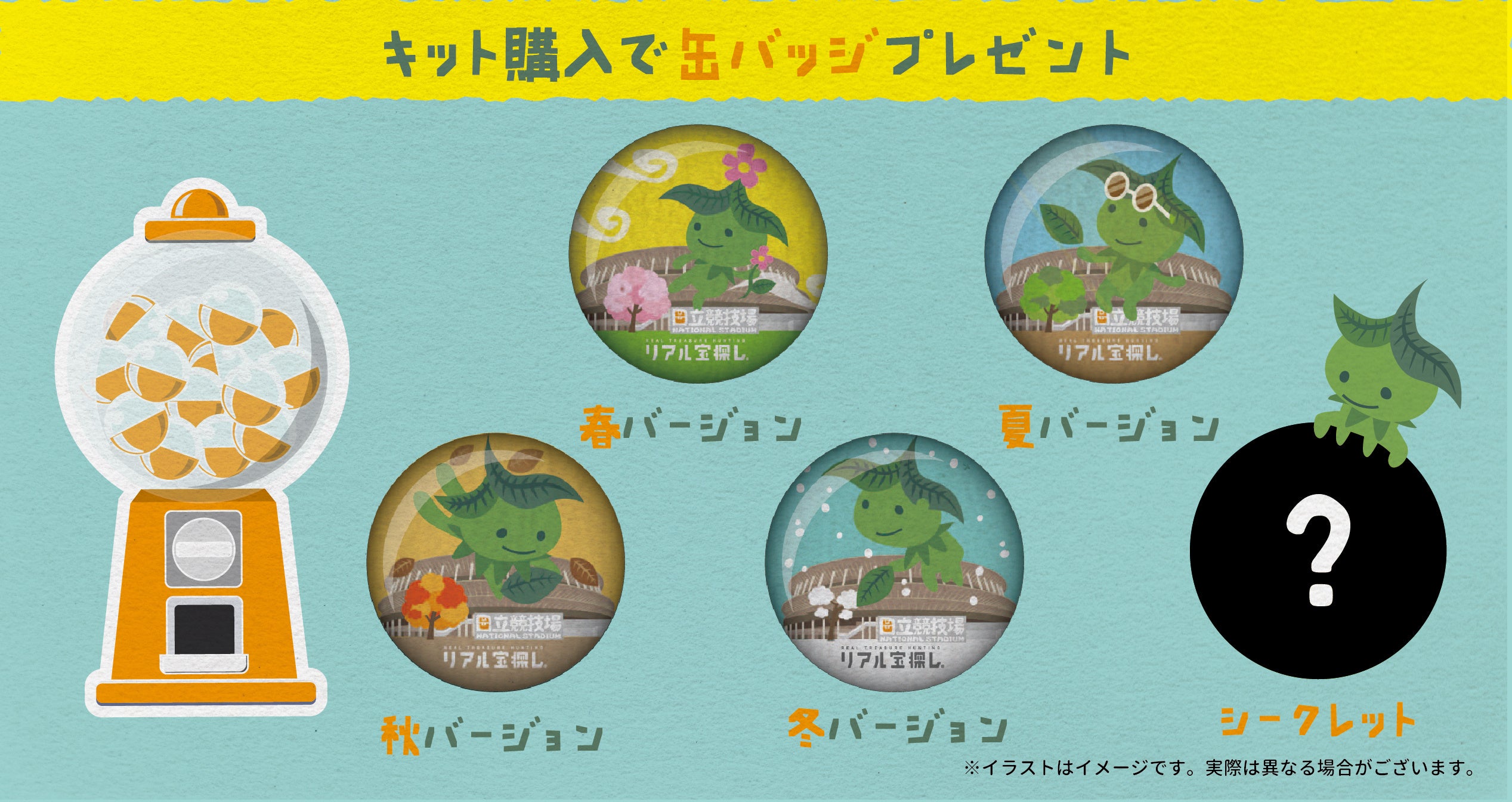 チケットボックス付近に設置されたカプセル販売機を回すと、中には参加キットの引換券とオリジナルの缶バッジが入っています。(缶バッジはシークレットを含む5種類)キットを手にしたら、国立競技場の外周を散策する冒険へ出発!
