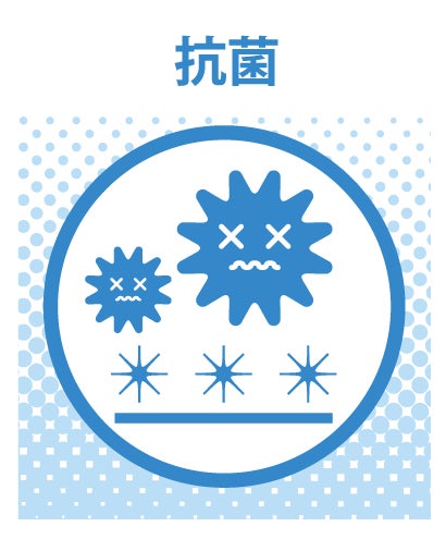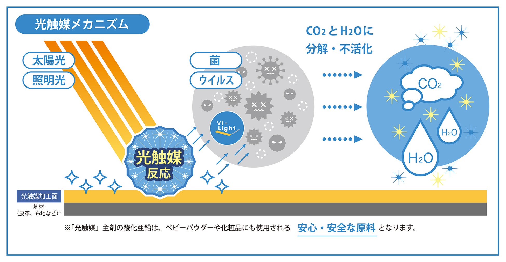 抗菌・抗ウィルスとなる仕組みは、「Vi-Light™」加工を施した素材の表面に光が当たると「光触媒・強酸化反応」が発現し、表面に付着した有害菌やウイルスを分解・不活化させます。特徴は、紫外線を含む太陽光だけでなく、蛍光灯やLEDなど照明光(可視光)にも反応し効果を発揮することです。