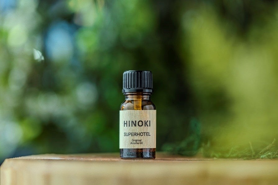 スーパーホテルでは、お客様に「ぐっすり」と快眠していただくために、枕、マットレス、照明などの他、香りにもこだわっています。森の中にいるような清々しい香りでリラックスしていただくために、ホテルロビーや、旗艦店舗や全国のPremier店舗のエレベーター内、大浴場脱衣所に天然ヒノキのアロマを使用しています。