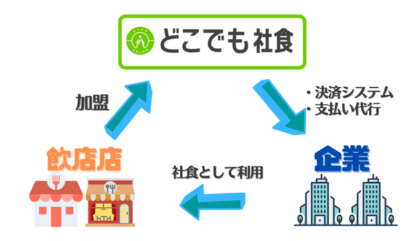 どこでも社食は、自社に社員食堂の設備を持たない企業でも、近くの飲食店と提携する事により「社食」環境を実現出来るサービスです。