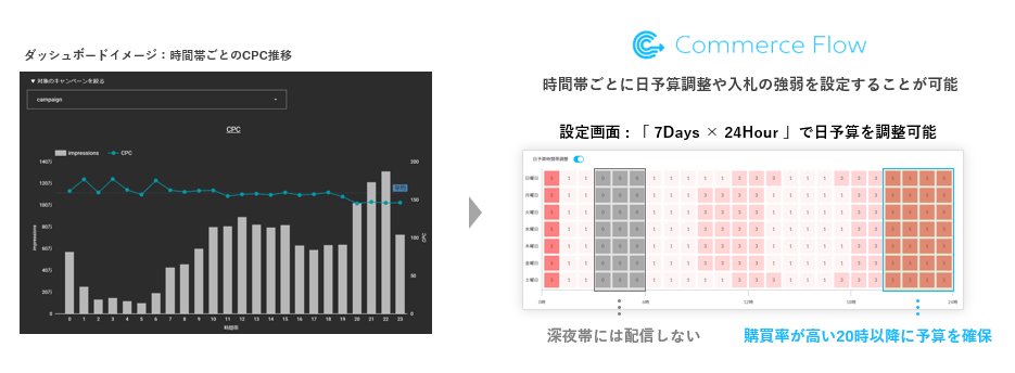 その結果を基に、ECサイトの広告運用最適化プラットフォーム「Commerce Flow」*による入札調整を行うことにより、パフォーマンス最大化を目指します。