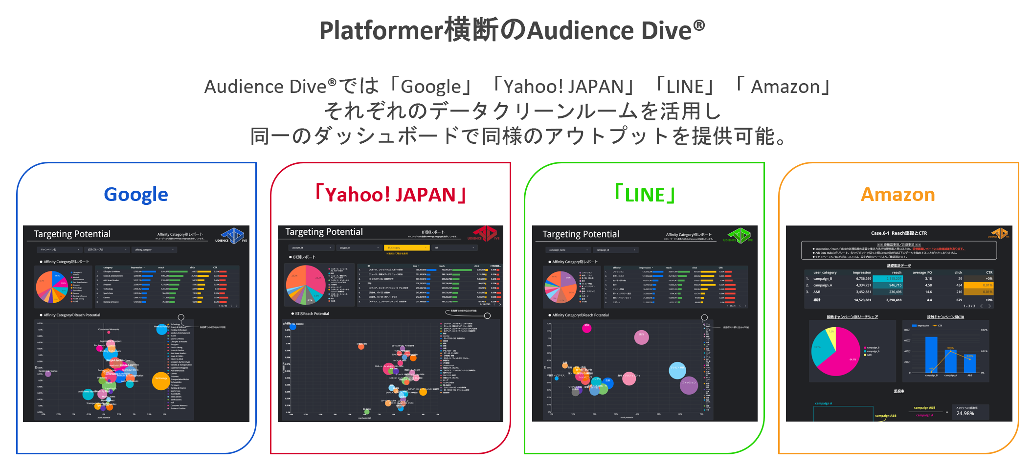 株式会社博報堂DYメディアパートナーズ(本社:東京都港区、代表取締役社長:矢嶋弘毅、以下 博報堂DYメディアパートナーズ)とデジタル・アドバタイジング・コンソーシアム株式会社(本社:東京都渋谷区、代表取締役社⾧ CEO:島田雅也、以下 DAC)は、配信時の設計にとらわれない自由度の高いデジタル広告プラニングを可能にするソリューション「Digital AaaS プラニング」を支える「 Audience Dive®」(データクリーンルームを活用し広告オーディエンスの多面的な深堀分析をダッシュボード上で提供するシステム。商標登録済)(※1)の対応メディアに「Amazon」を追加し、Amazon Marketing Cloud(以下、AMC)(※2)に対応したサービスの提供を開始します。