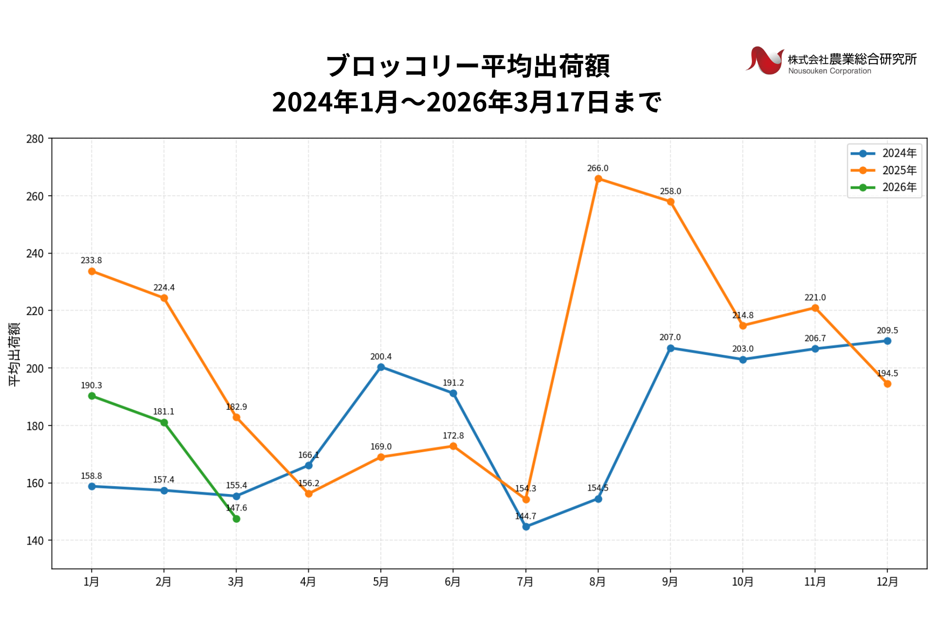 「農家の直売所」におけるブロッコリーの平均出荷価格は、2024年・2025年・2026年を通じておおむね150〜230円の範囲で推移しています。