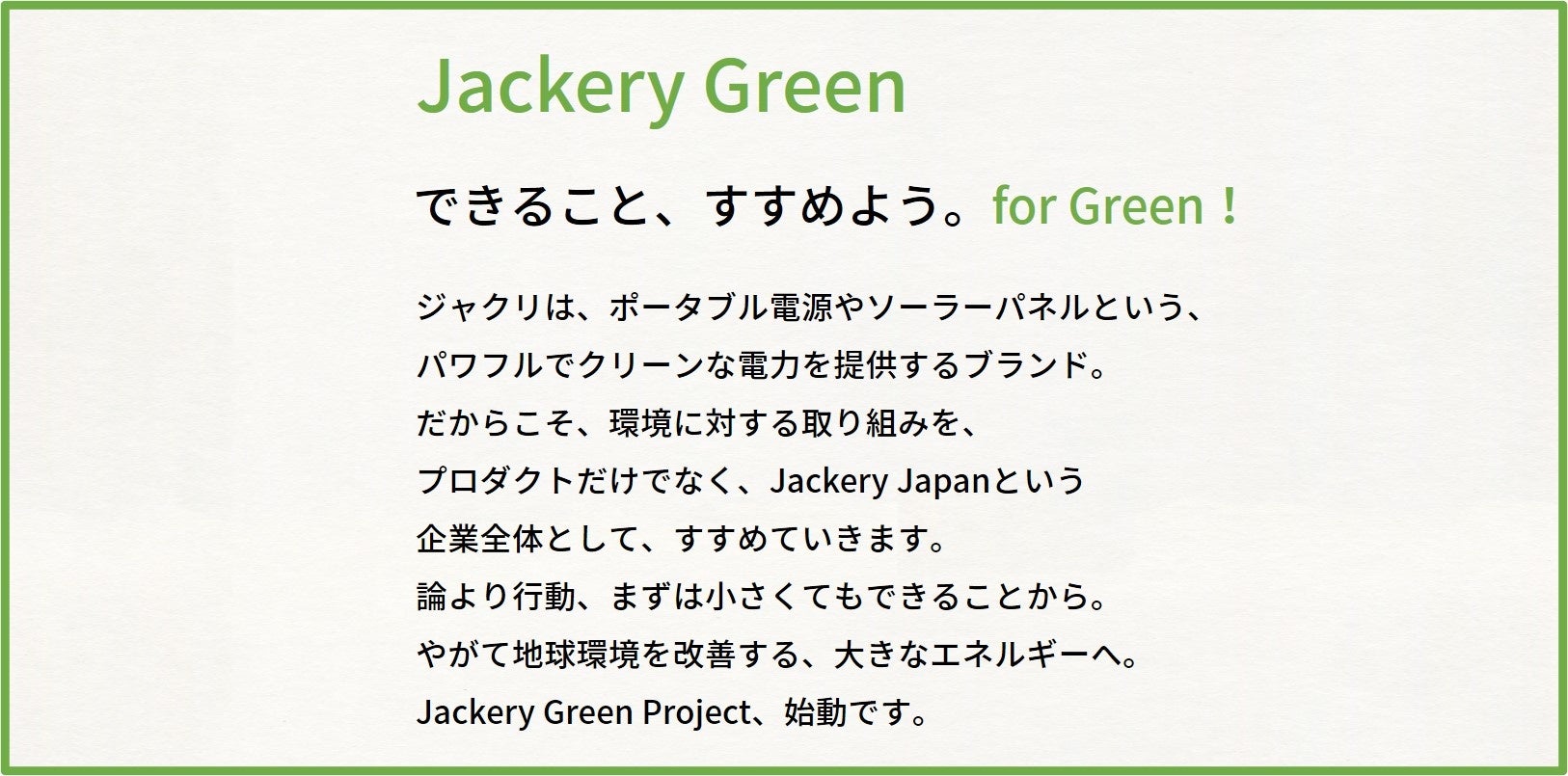 Jackery Greenとは「できること、すすめよう。for Green!」をキャッチコピーとして株式会社Jackery Japanの環境活動プロジェクトとして、2022年に発足いたしました。