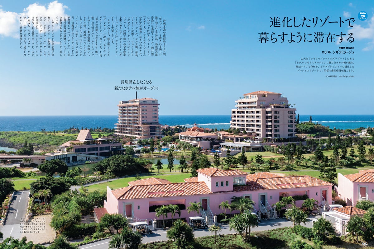 日本を代表するリゾートエリア・沖縄。何度訪れても魅力が尽きない沖縄のリゾートをご紹介。“宮古ブルー”を堪能する「ホテル シギラミラージュ」、沖縄の粋を集めた「星のや沖縄」、石垣の魅力を堪能できる「フサキビーチリゾートホテル&ヴィラズ」、あのオリオンビールのホテル「オリオンホテル モトブ リゾート&スパ」と魅力的なリゾートを大解剖しています。