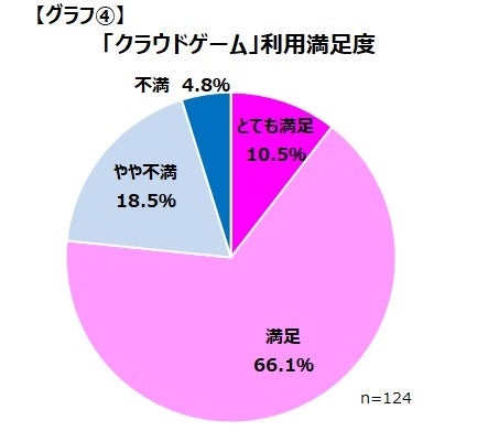 次に「クラウドゲーム」について聞くと、先ほどの「サブスクリプションサービス」と同様、利用経験は4.3%と少数でしたが、利用満足度は、「とても満足」と答えたのは10 .5%、「満足」と答えたのは66.1%でした。「ゲームのサブスク」と比較すると、満足度はやや下がる傾向ではありますが、それでも利用者の7割以上が満足と回答しています。【グラフ④】