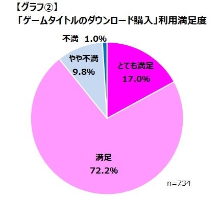 ゲームのダウンロード購入経験者は全体の約1/4と、まだまだ多数派とは言えませんが、利用満足度を聞いてみると「とても満足」と回答したのは17.0%、「満足」と答えたのは72.2%で、合計89.2%と、9割近いゲーマーが満足していることがわかりました。【グラフ②】