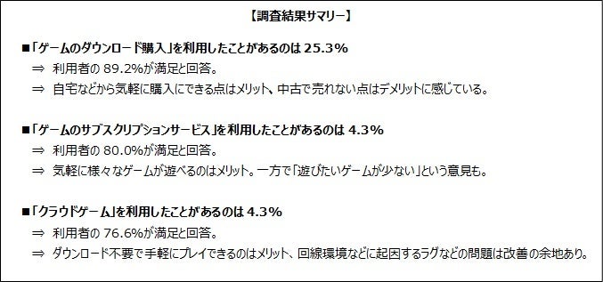 このように、「ゲームのダウンロード購入」「ゲームのサブスクリプションサービス」「クラウドゲーム」など新形態のサービス利用者は、先進性が高いと思われているゲームユーザーの中でもまだまだ少数派ではありますが、利用したゲーマーの満足度は総じて高いということがわかりました。
