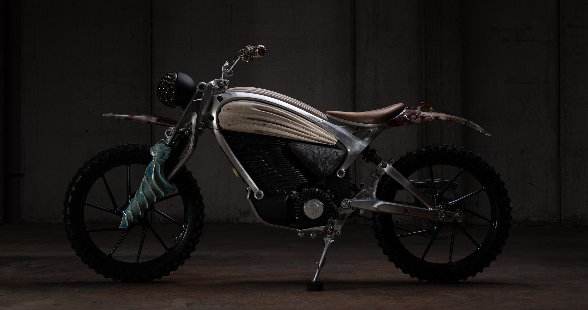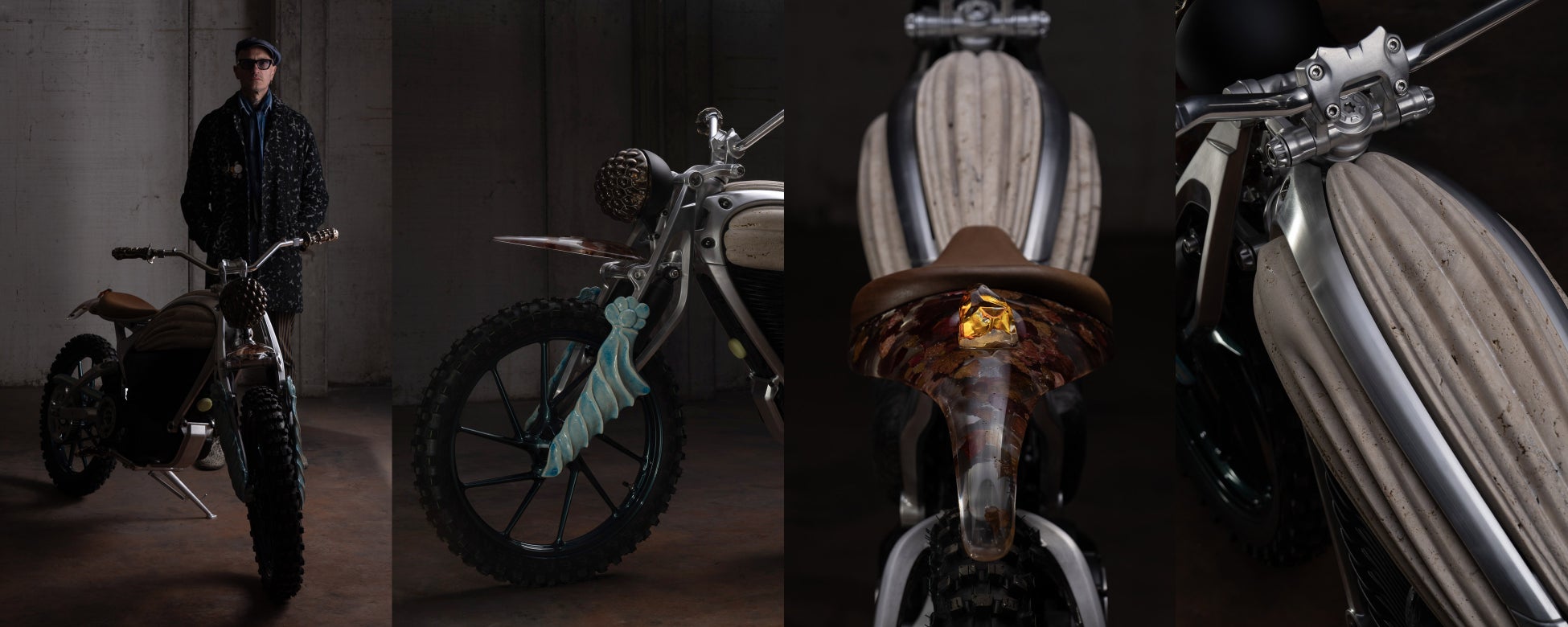 トラバーチン、粘土、ブロンズ、石、レザー、そして吹きガラスといった多様な素材を活用し、FF.C6をキャンバスに独創的なカスタムバイクを創造
