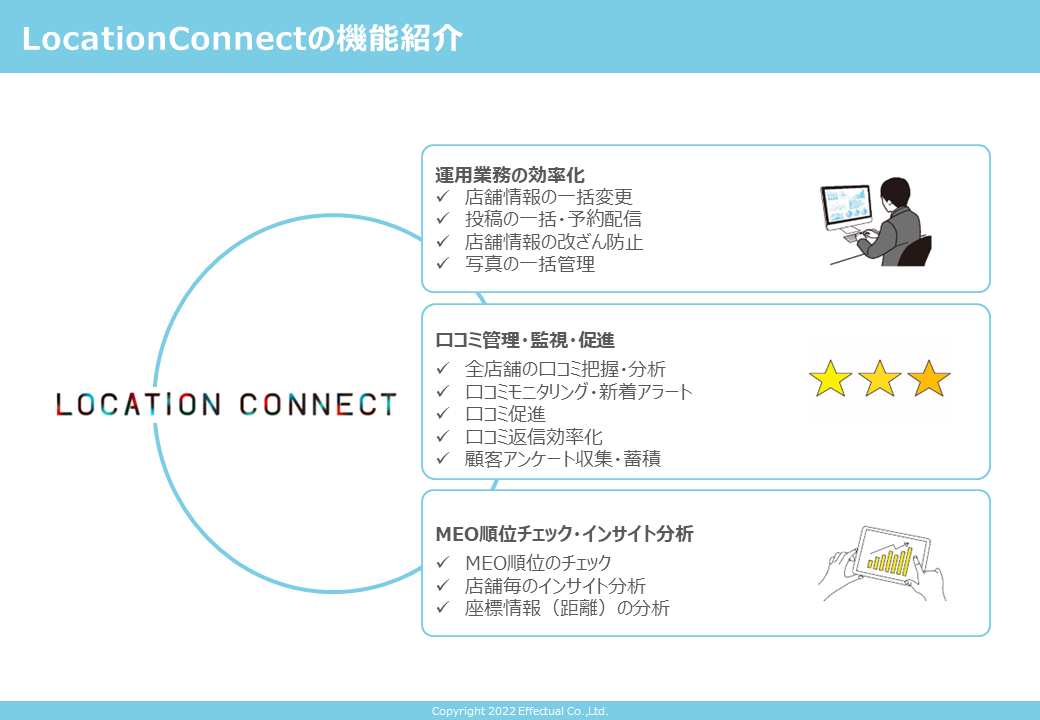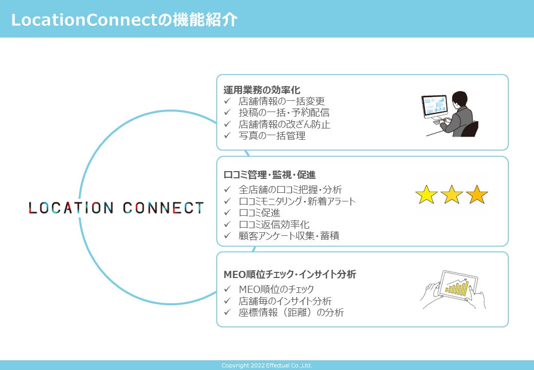 2019年のサービスリリース以降、個店から複数店舗を展開する企業まで約27,000店舗に導入頂いており(2022年5月時点)、効果的なGoogleビジネスプロフィール運用、MEO対策、Googleの口コミ管理まで、ワンストップでの支援が可能です。近年では複数店舗を運営する企業でのGoogleビジネスプロフィールの運用やMEO対策のインハウス化が進み、Googleビジネスプロフィール運用のための業務負荷が増加しています。エフェクチュアルではこれらの業務課題を解決するためのソリューションとして複数店舗向けMEOツール「Location Connect」を提供しています。