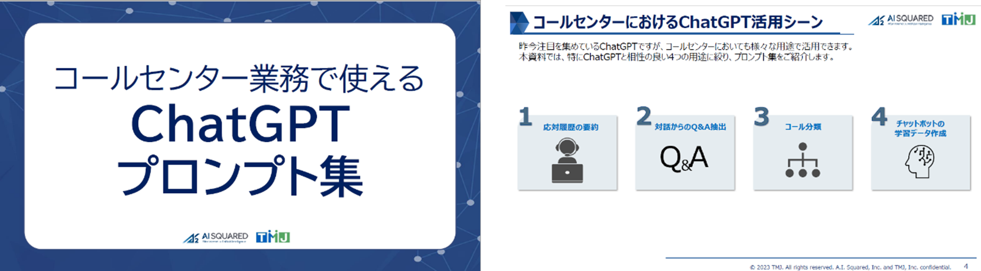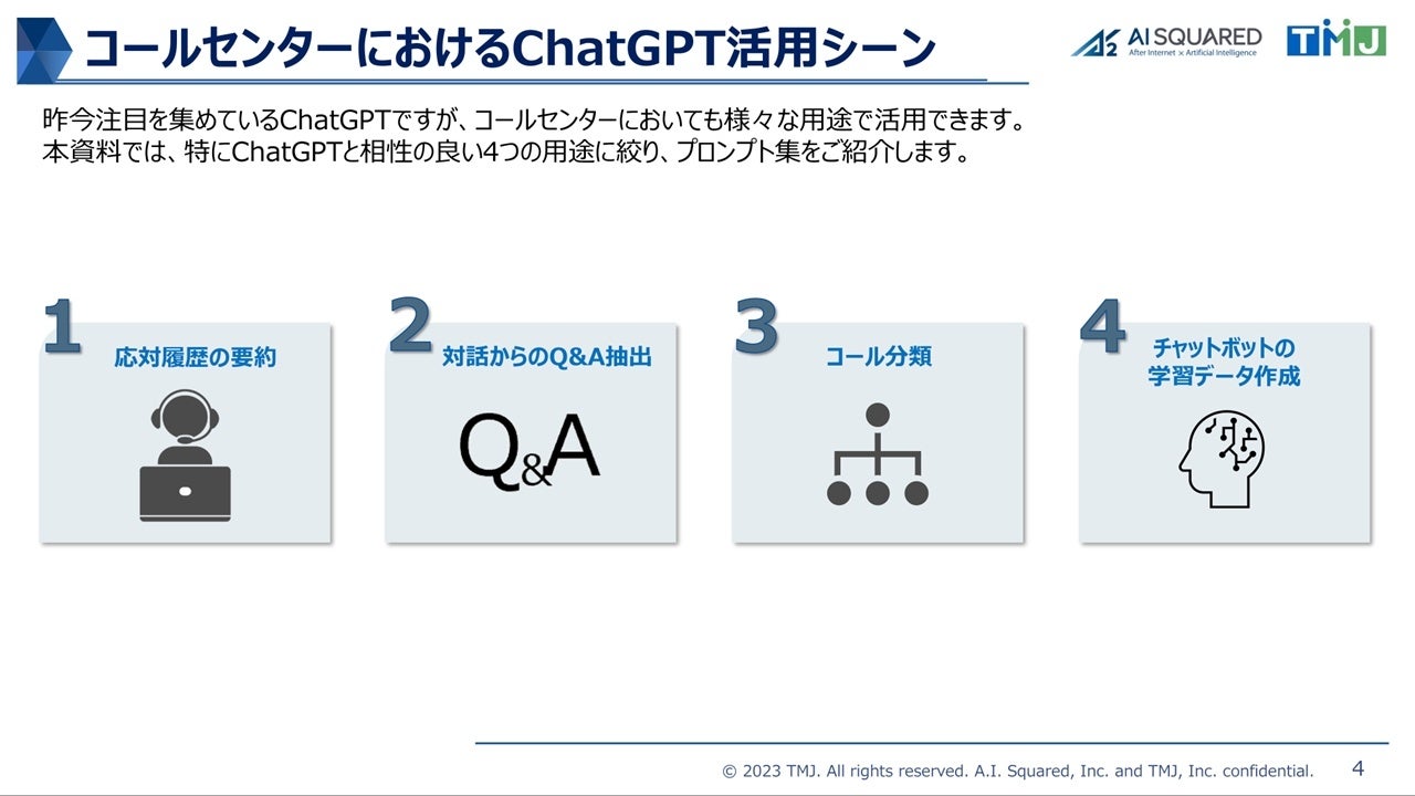 TMJはこの度、当社と共同で生成AI導入支援を行うエーアイスクエアの協力のもと※2、「コンタクトセンター業務でつかえる対話型生成AIプロンプト集」を作成。カスタマーサポート部門で広く利用いただけるよう、基礎的な内容を網羅したプロンプト例と、入力のコツなどを収めた内容として自社HPで公開しました。