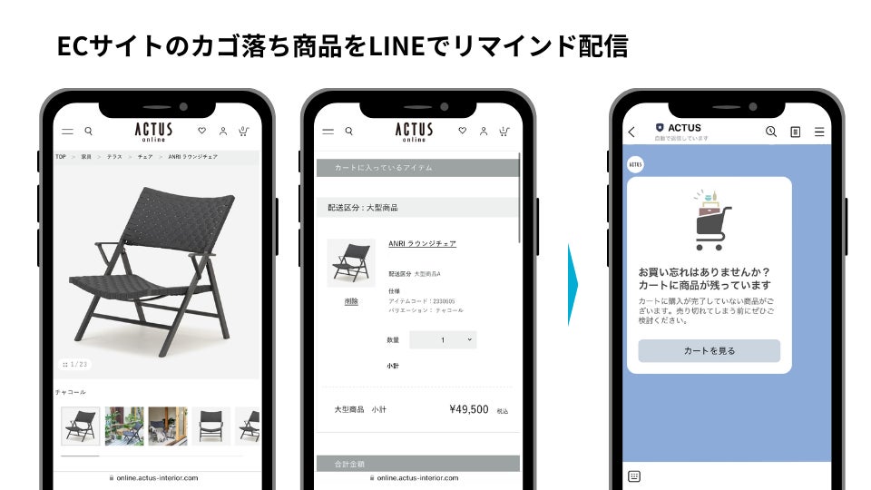 家具・インテリアブランド「ACTUS」においても同様の課題があり、家具などの大型商品を購入する顧客は公式アプリをダウンロードする比率が高いものの、生活雑貨などを中心に購入するライトユーザーにおけるアプリ会員登録率は約2割にとどまっていました。そのため、残り8割のユーザーとは継続的にコミュニケーションできる接点が構築できていない状況でした。