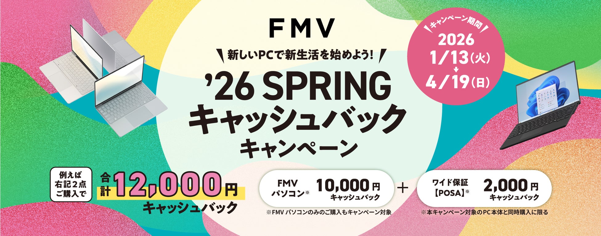 モバイルパソコンを対象とした「FMV ’26 SPRING キャッシュバックキャンペーン」を実施しています。対象商品をご購入・お申し込みいただいたお客様にキャッシュバックを行い、新生活のスタートをサポートします。なんと2026年1月13日に発表した新商品も対象に!新入学・新生活に備えて是非この機会にご活用ください。
