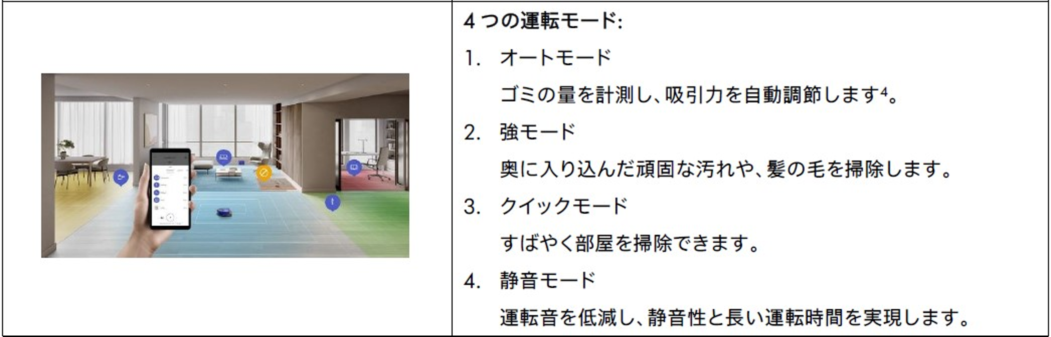 1. オートモード:ゴミの量を計測し、吸引力を自動調節します⁴。
